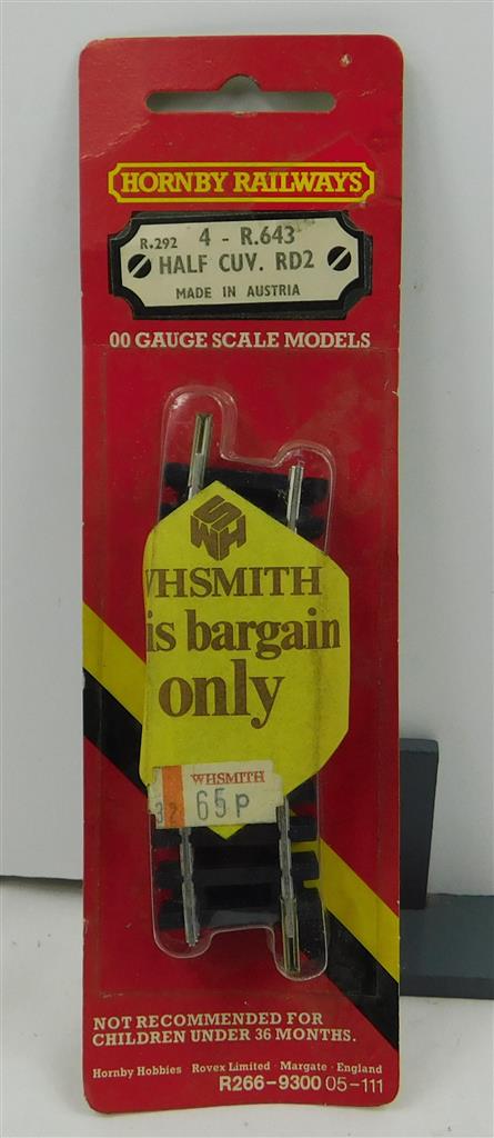 An unopened Hornby R292 pack of 4 R643 Half Curves, Steel Rails, still with the circa 1980 design WH Smith price labels