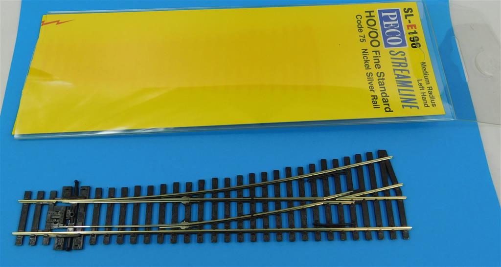 A Peco SL-E196 Left Hand Medium Radius Point, Electrofrog, Code 75, in good condition, supplied in the original packet opened at the bottom
