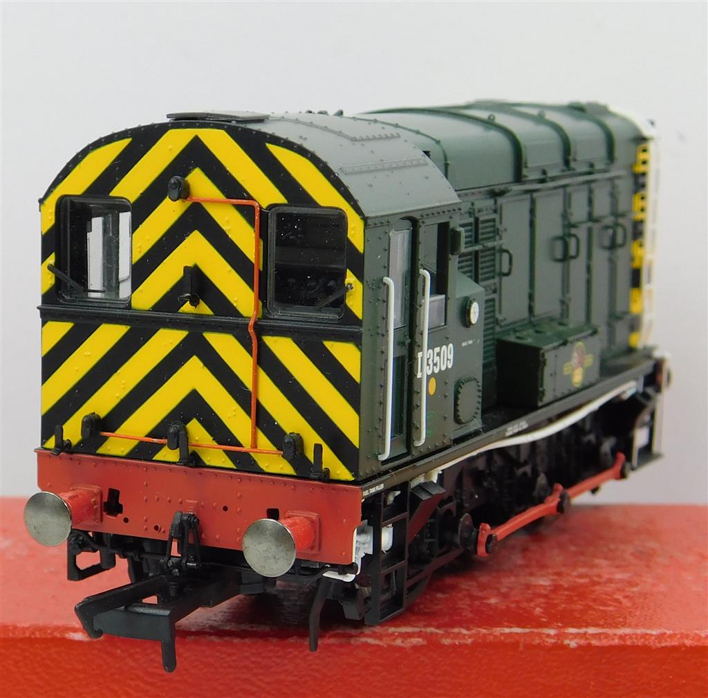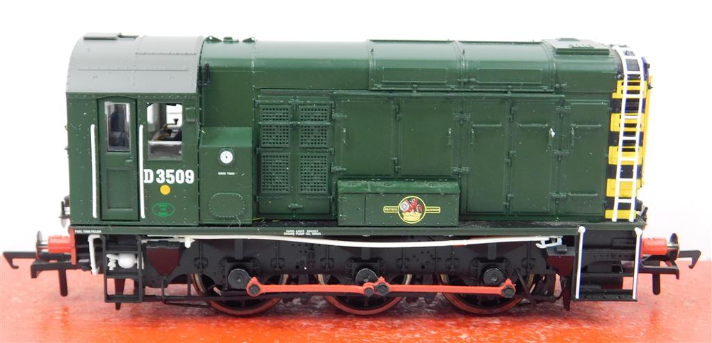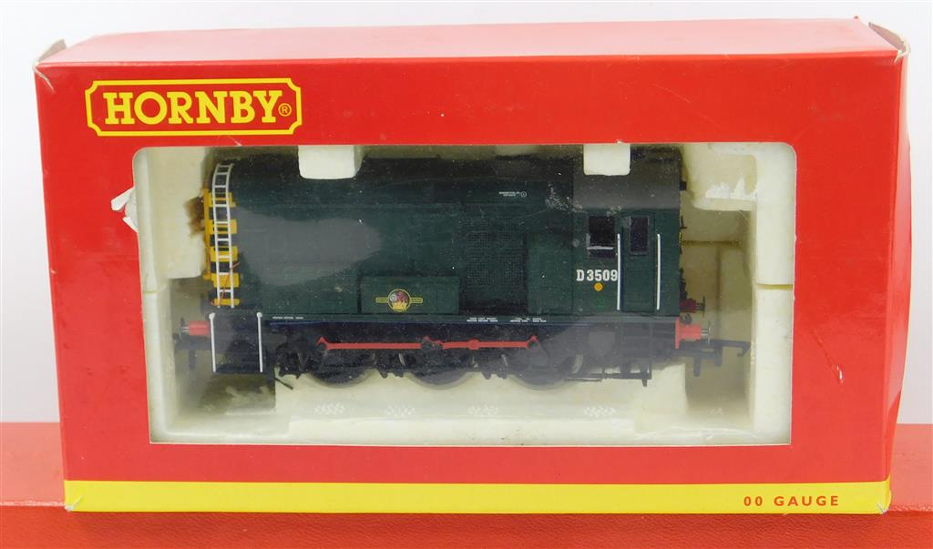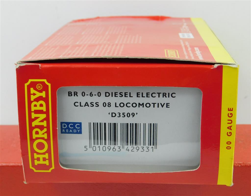 A Hornby class 08 number D3509, DCC fitted (Hornby chip,#'3), runs on both DC and DCC with a rhythmic clatter, mechanics needs investigating and fixing, in good cosmetic condition, supplied in the original box