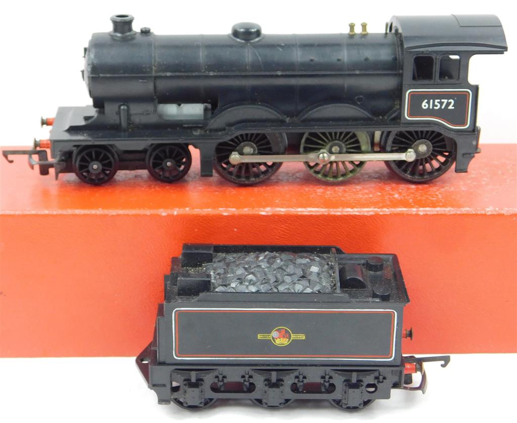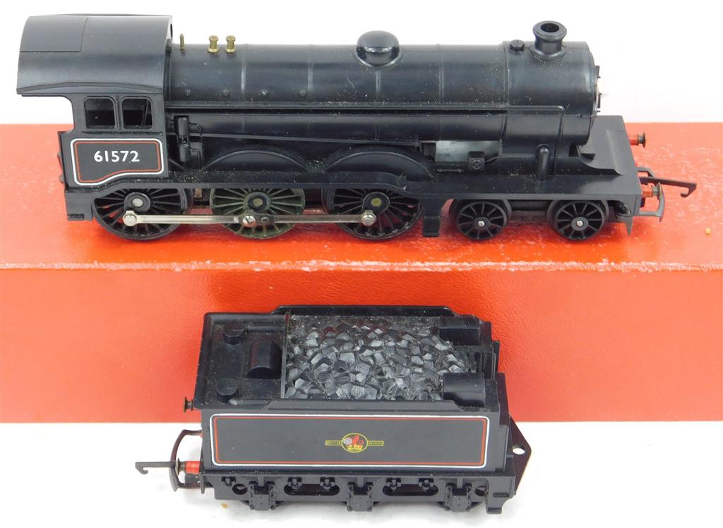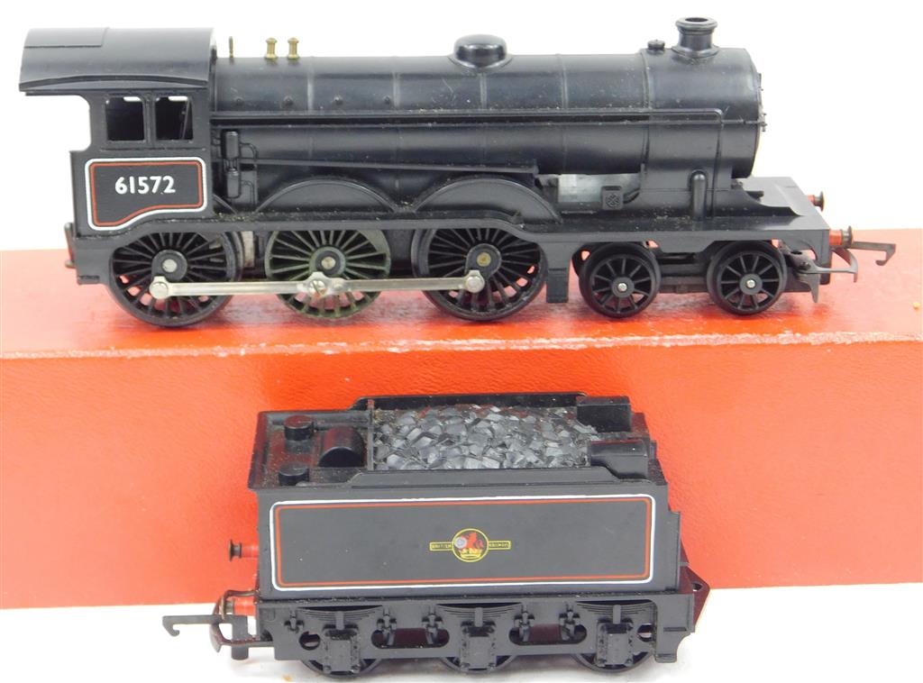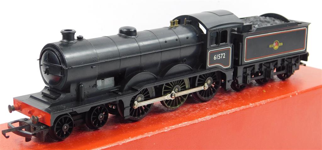A Tri-ang B12 4-6-0 Steam Loco BR Black number 61572, tested and in working order and good condition, no original box. Please note this loco needs a controller capable of delivering at least 1A to run well, and doesn't like new Hornby or Peco points as it has deep thick flanged wheels.