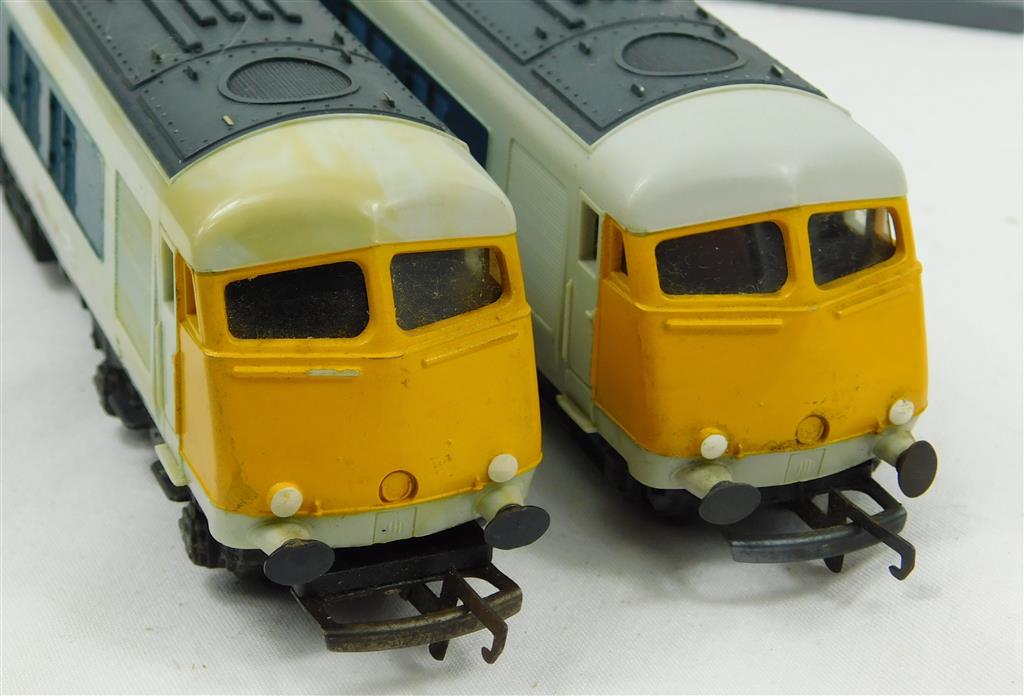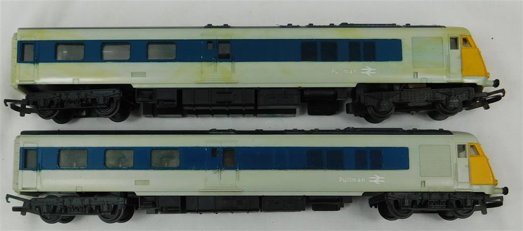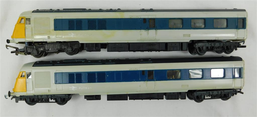 A late 1960s production Tri-ang Hornby grey and blue 2 car Pullman set, good runner, some lettering loss and discolouration, in fair condition, no original box. Please note this loco needs a controller capable of delivering at least 600mA to run well, and doesn't like new Hornby or Peco points as it has deep flanged knurled wheels.