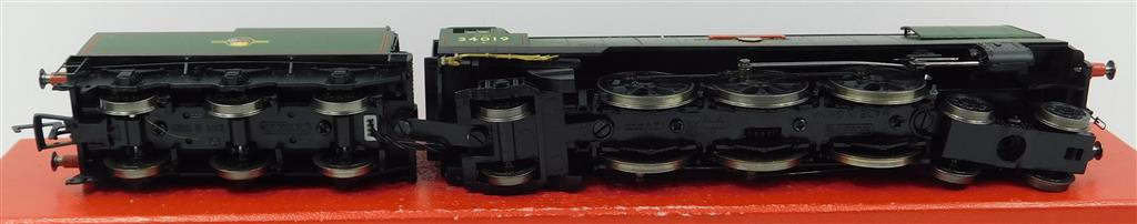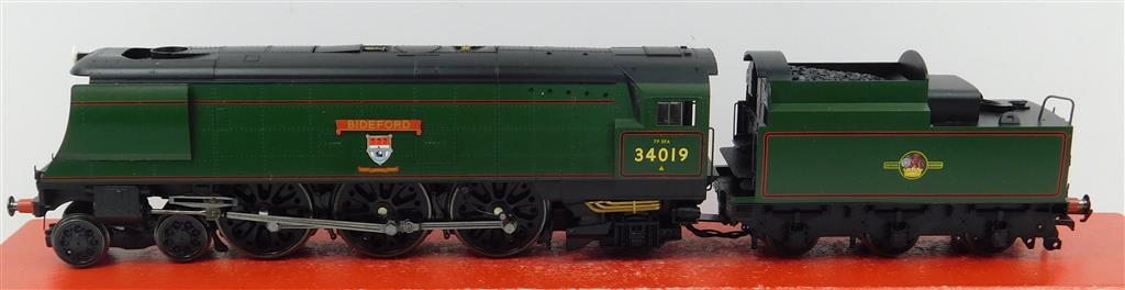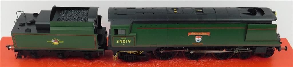 A Hornby BR West Country class steam loco 34019 Bideford, good runner, small added details with a few glue spots otherwise in good condition, no original box
