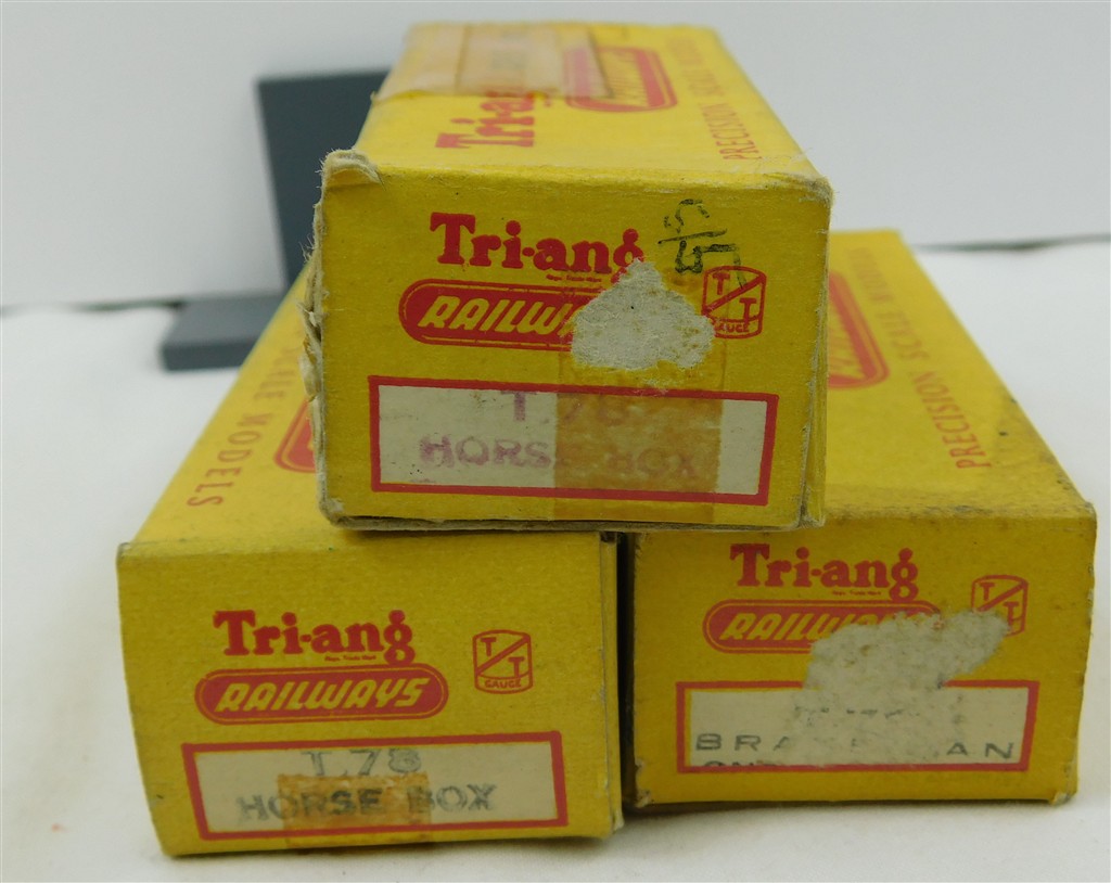 5 Tri-ang TT maroon horse boxes, will need a clean, condition varies, three supplied with original boxes