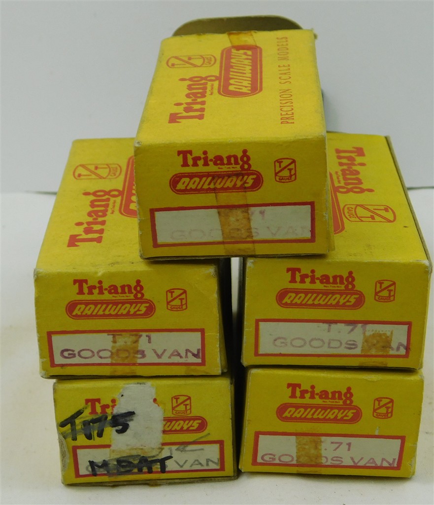 5 Tri-ang TT grey goods vans, will need a clean, condition varies, all have boxes, but have added pen marks and labels.
