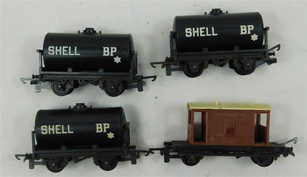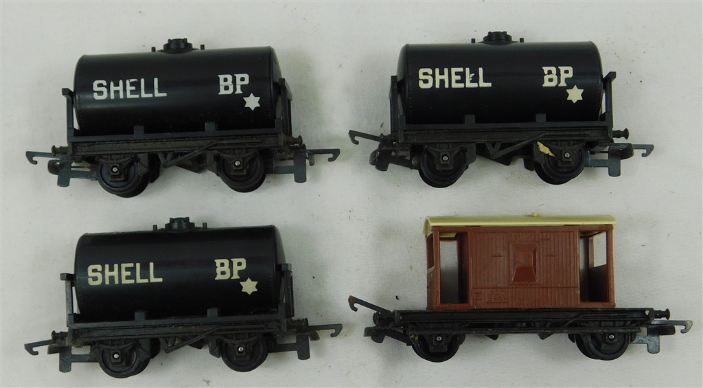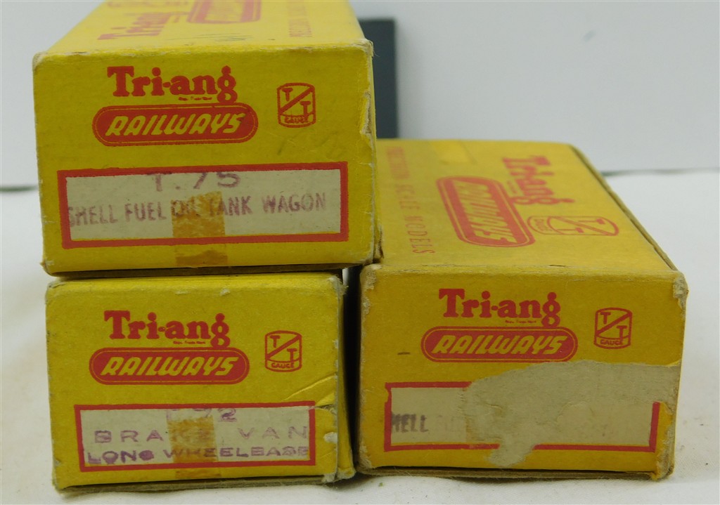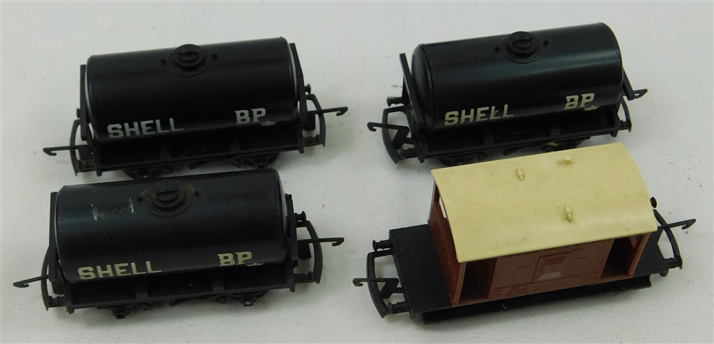 3 Tri-ang TT Black Shell/BP tank wagons plus brake van, will need a clean, condition varies, three supplied with original boxes