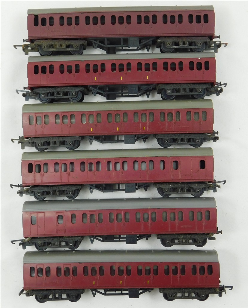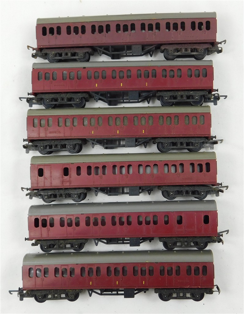 6 Tri-ang TT maroon Suburban coaches for spares,repair, repainting or remodelling, all in used condition, no original boxes.