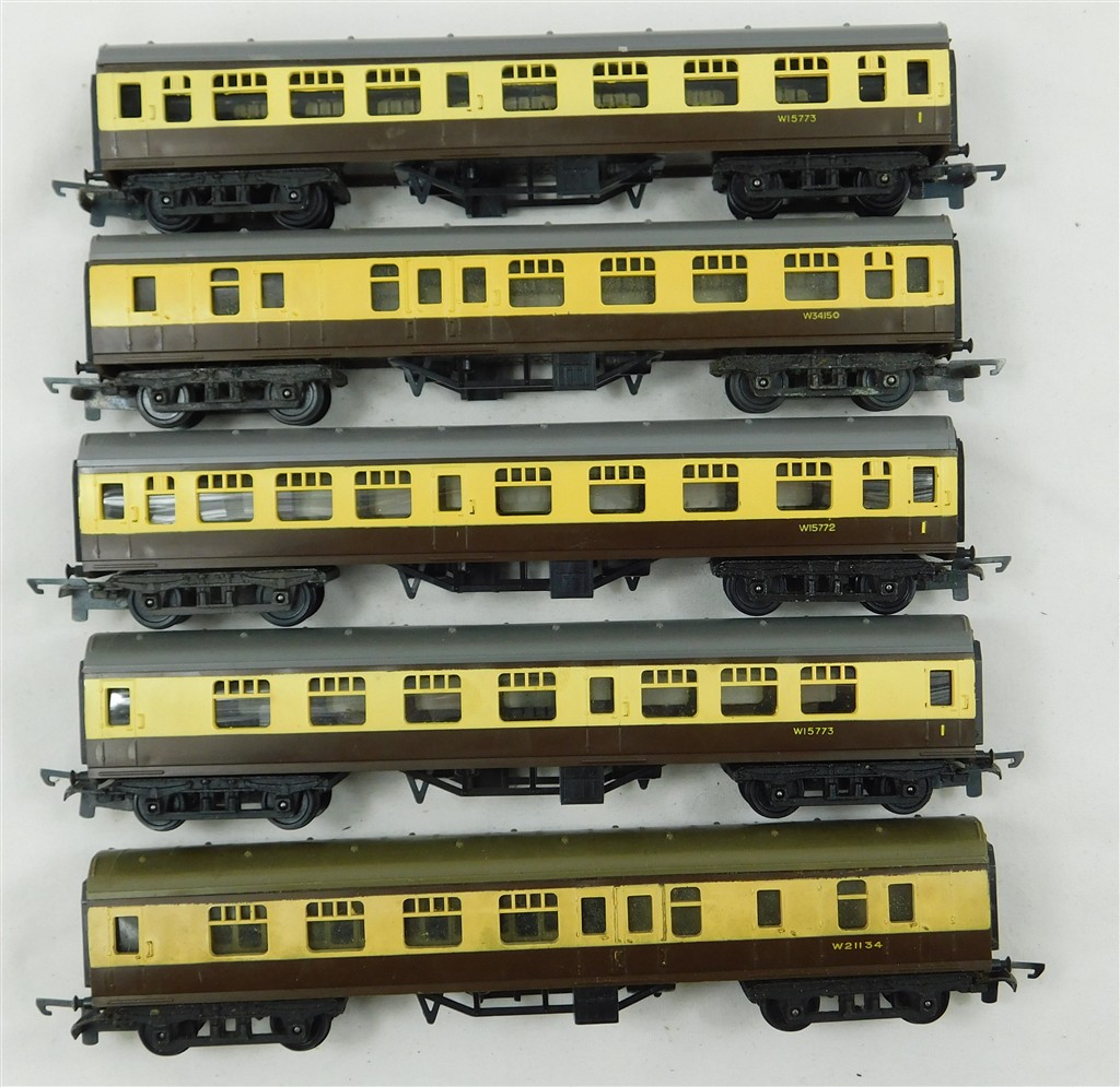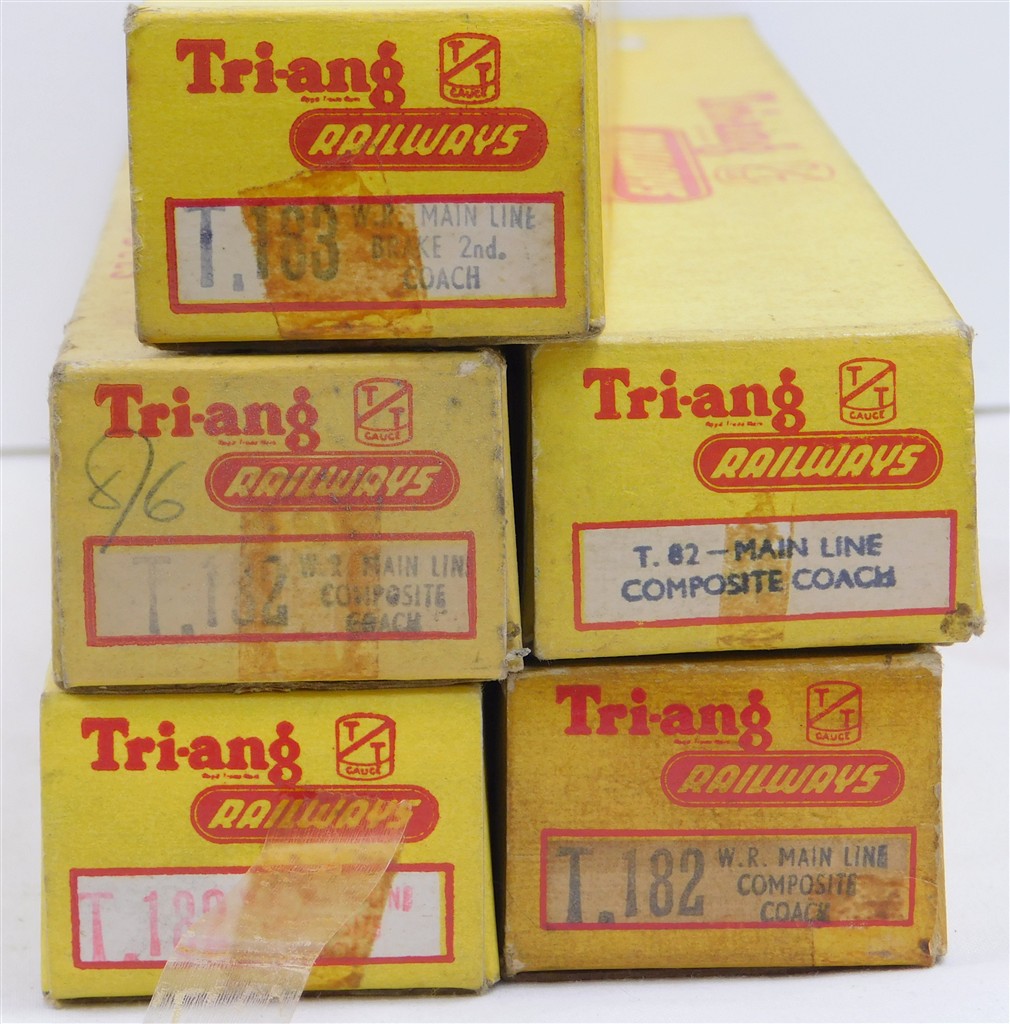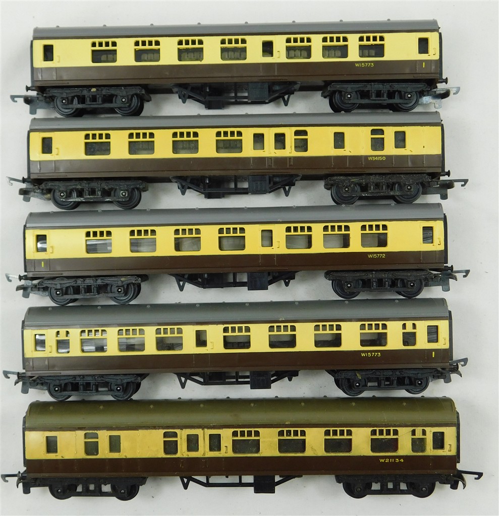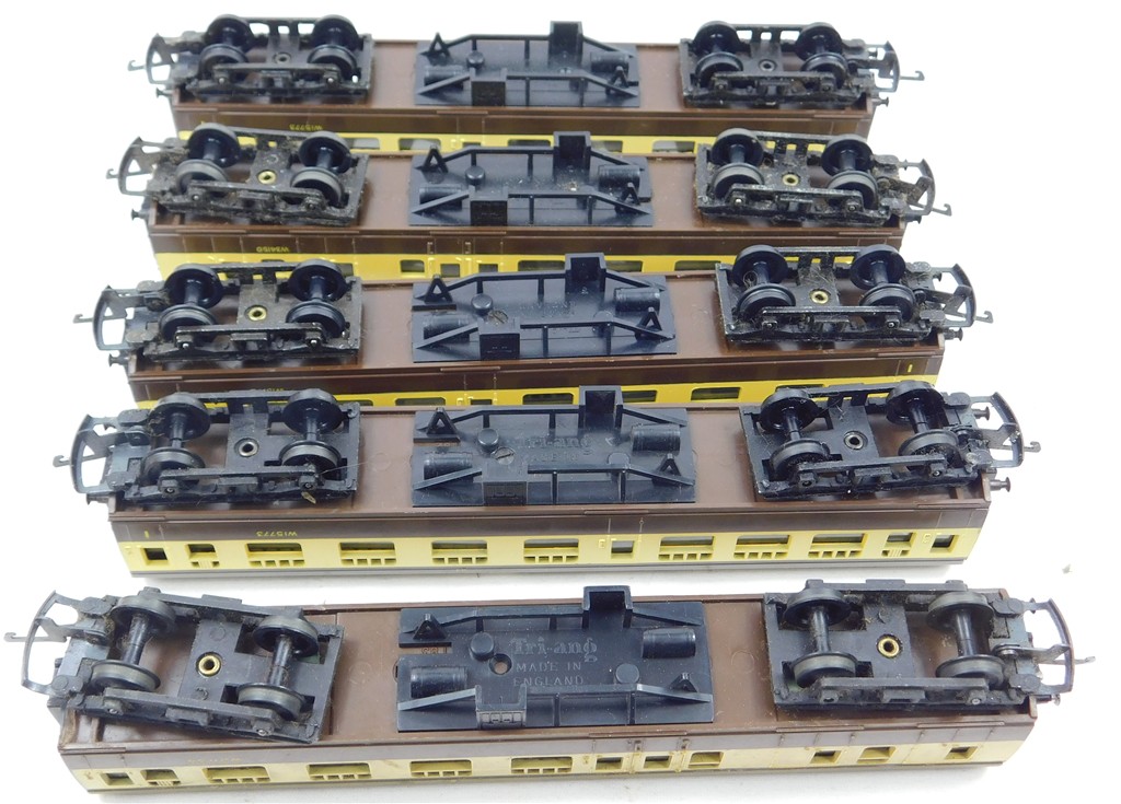 5 Tri-ang TT Western Region Choc and Cream Mark 1 Coaches, all in good used condition, with original boxes.