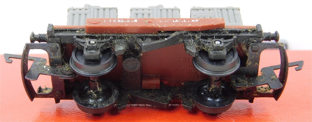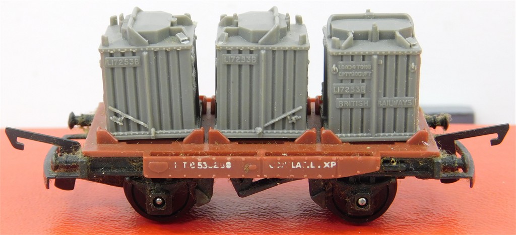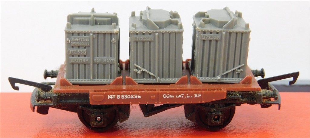 TT Gauge: Tri-ang TT T276 3 container wagon, bauxite body, dark grey containers