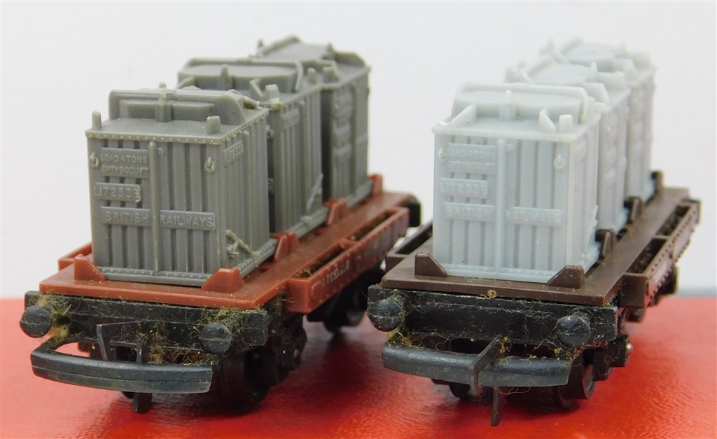 Tri-ang TT T276 3 container wagon, bauxite body, dark grey containers, in good condition, with original box. The last photo shows the contrast with the brown/light grey version