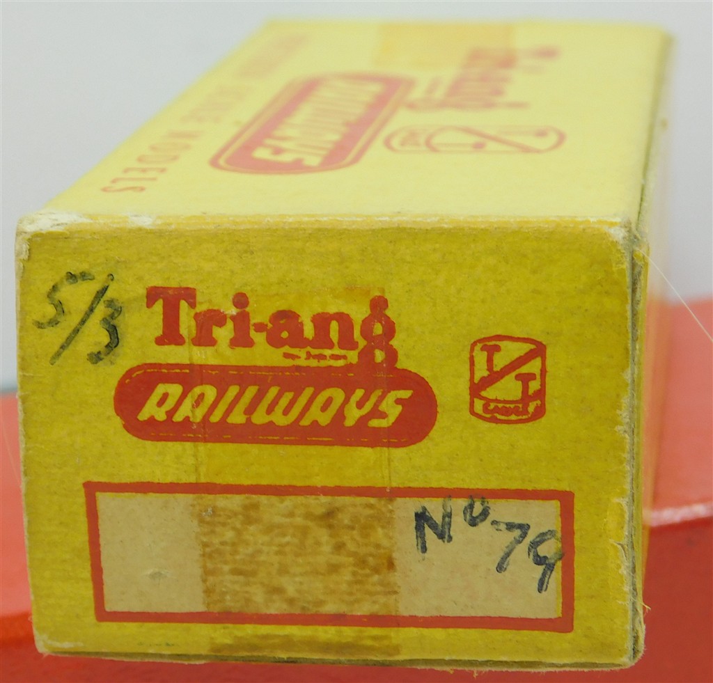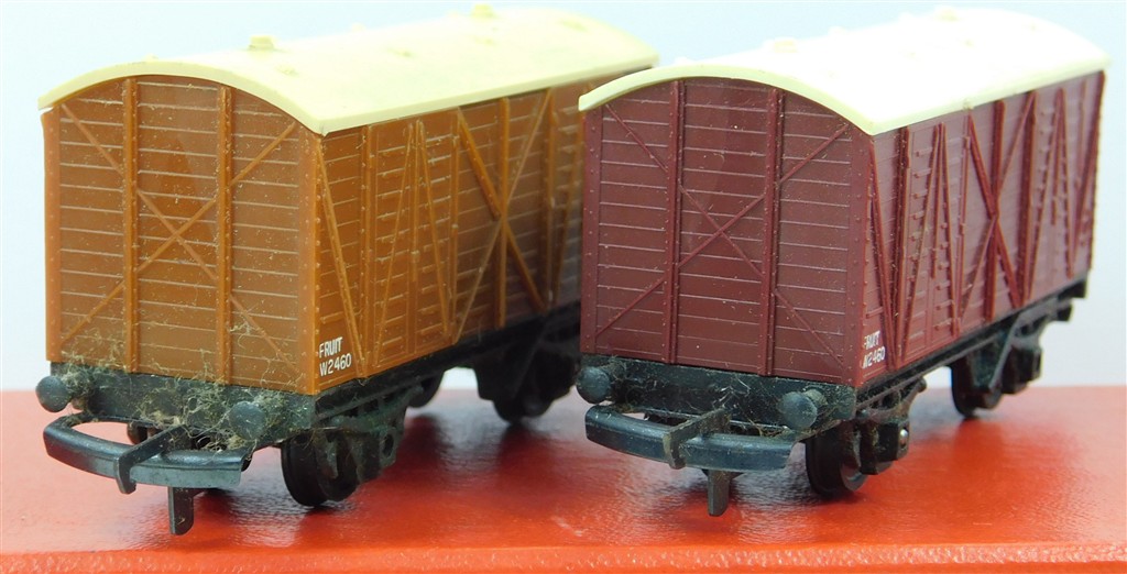 A Tri-ang TT T79 fruit van, maroon version, in good used condition, with original box. The last photo shows the contrast with the brown version