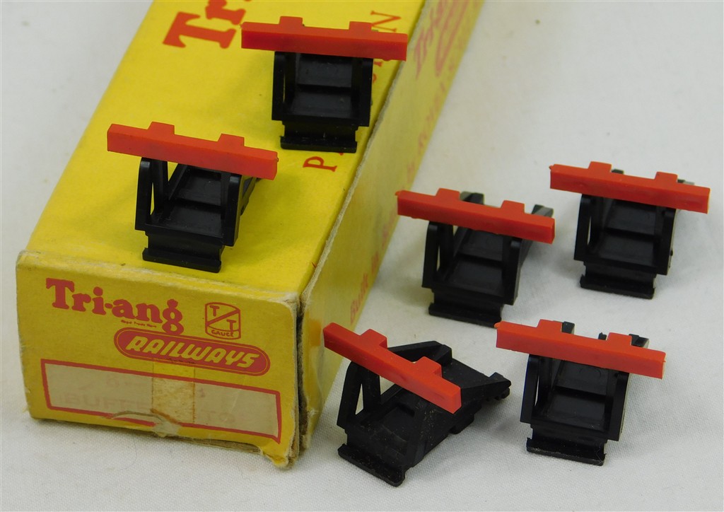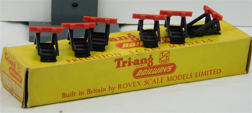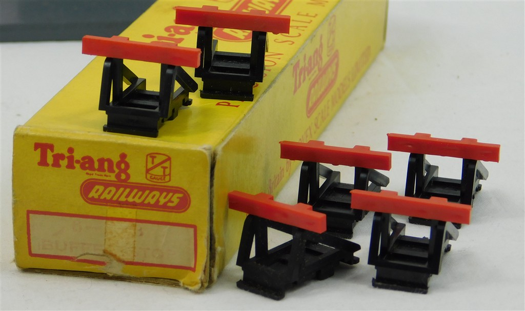 A box of 6 Tri-ang TT T155 Buffer Stops, unusual long box, in good condition