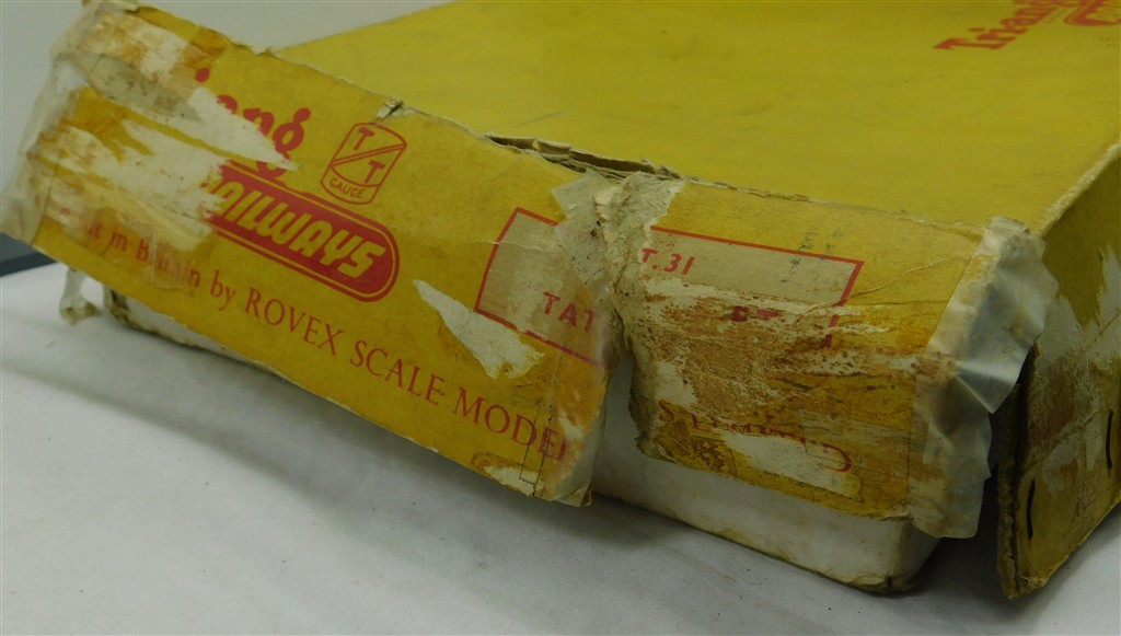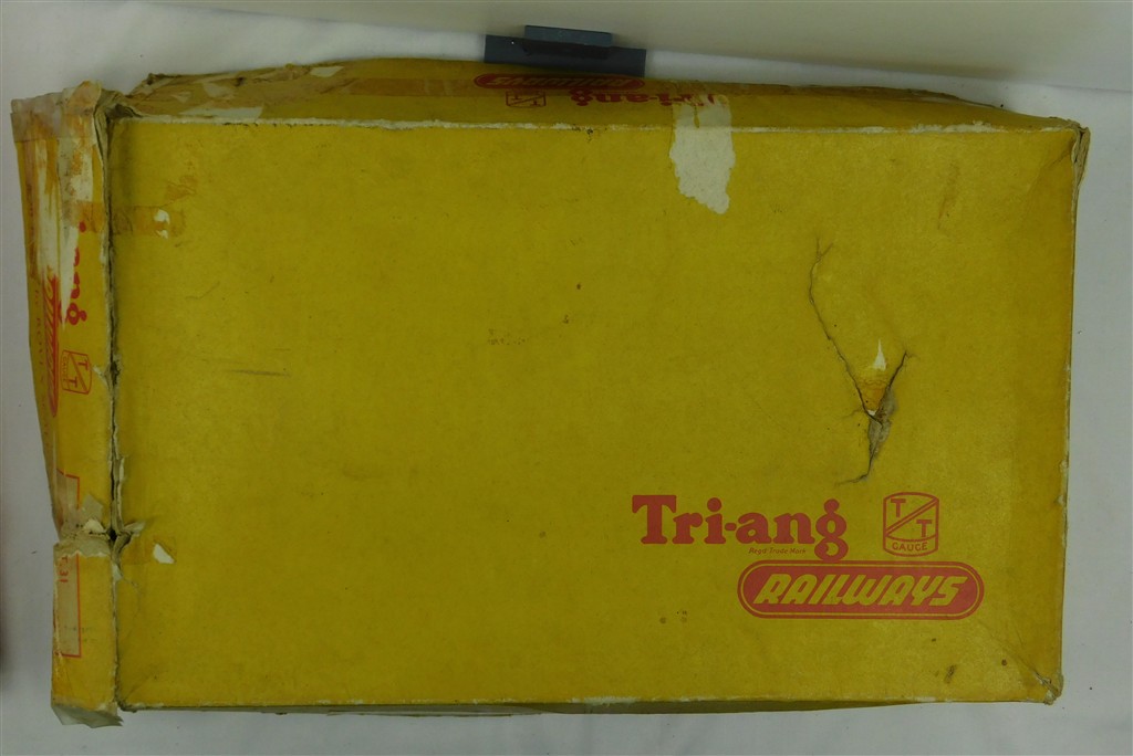 A Tri-ang TT Booking Hall with platform and steps, more platforms, footbridge, etc, loose warped glazing, in fair condition, some cracks on the partially glued together footbridge, supplied with a tatty original set box