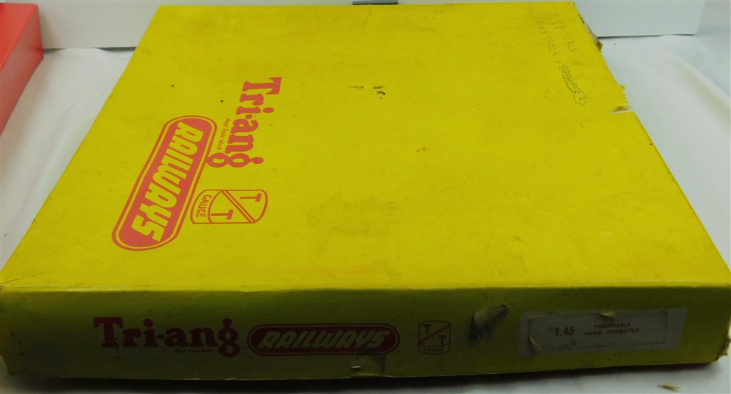 A Tri-ang TT electric turntable for type B track in a T45 box, good runner, in good condition, needs a good clean, supplied in a tatty original box