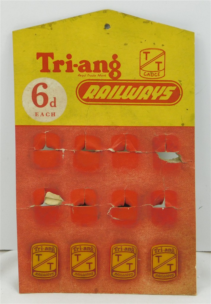TT Gauge: 4 Tri-ang TT lapel badges on a display card for 12