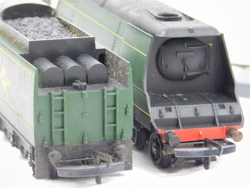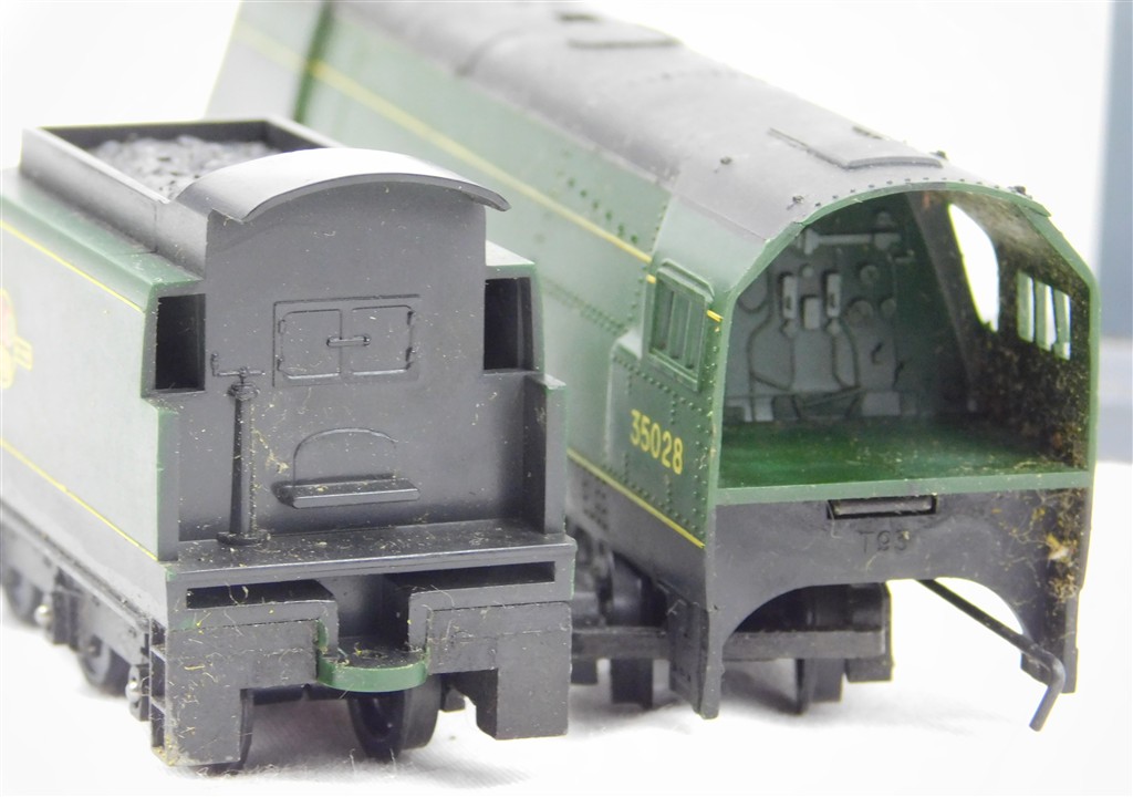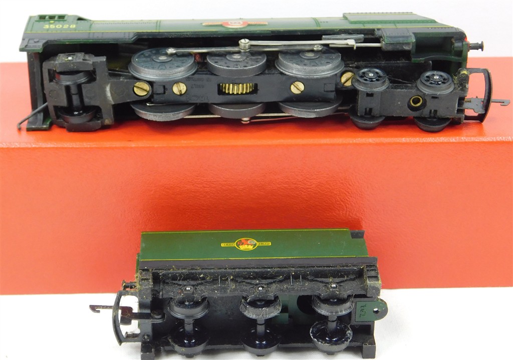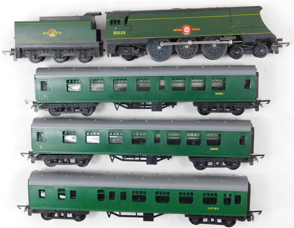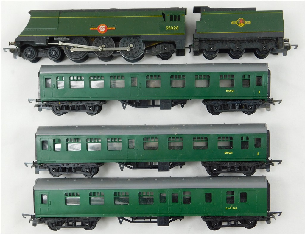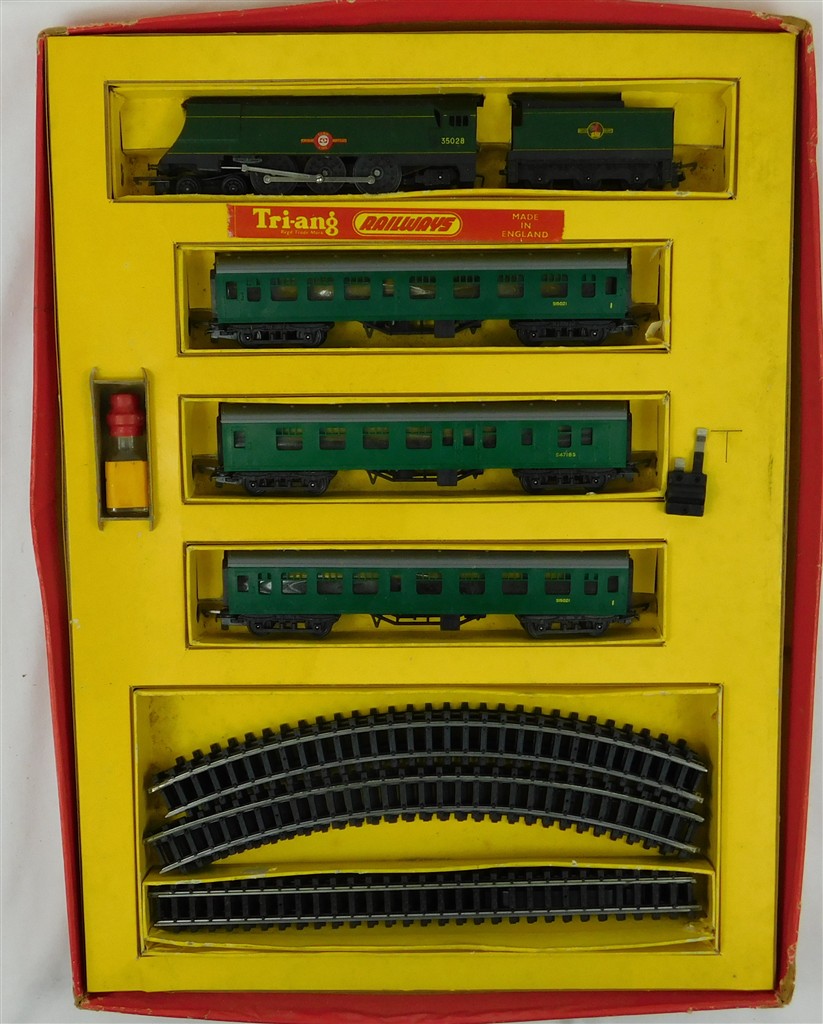 A Tri-ang TT T1 Clan Line set with 3 coaches, good runner, in good condition but needs a clean, supplied with an oval of track and a power clip, supplied in the tatty original box with instructions