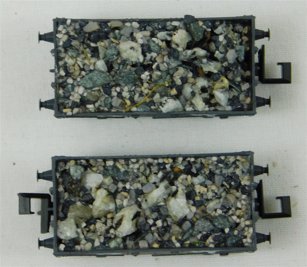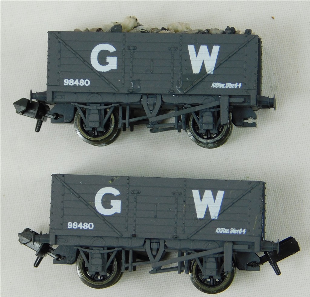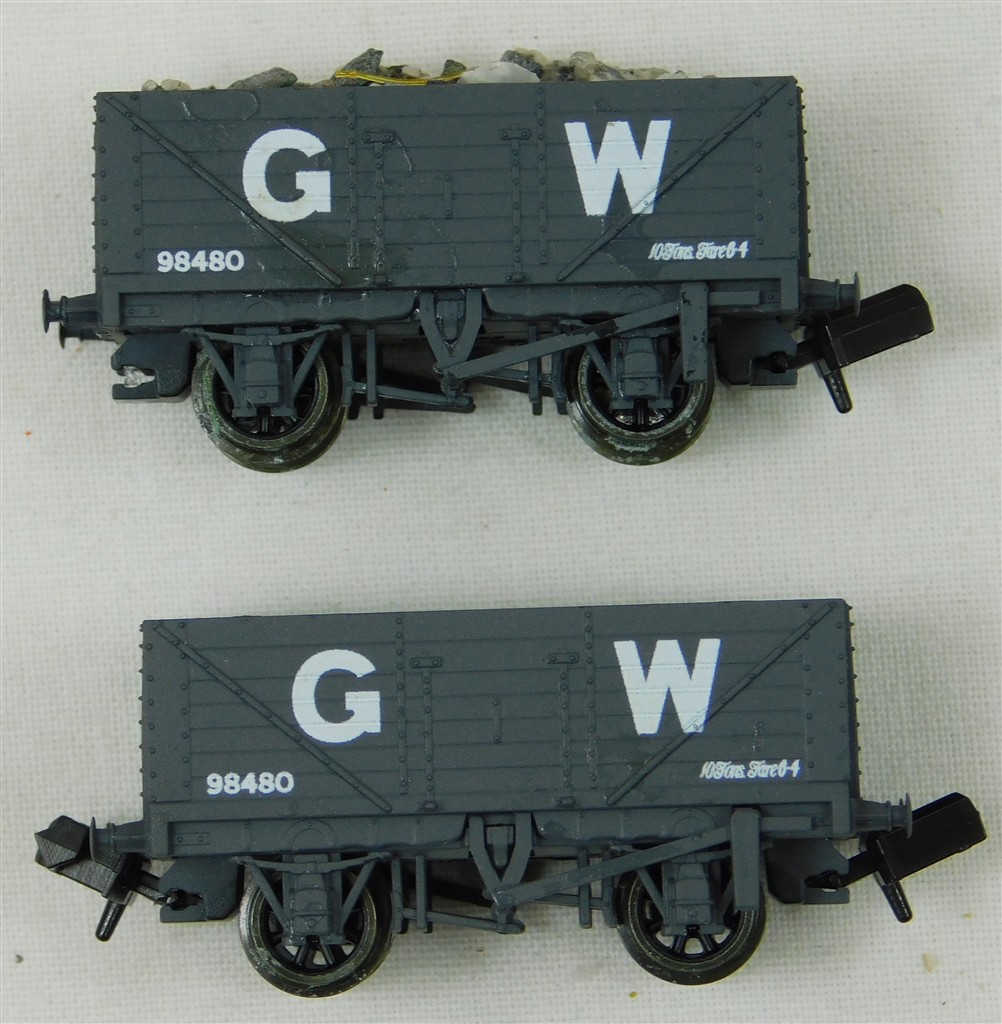 2 Peco N gauge GWR 7 plank wagons with added load, missing one coupling otherwise in good condition, no original box