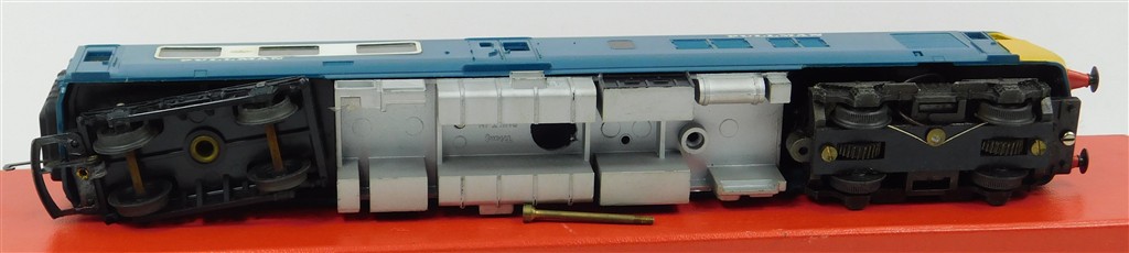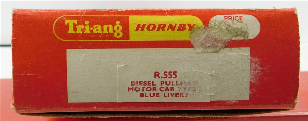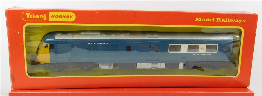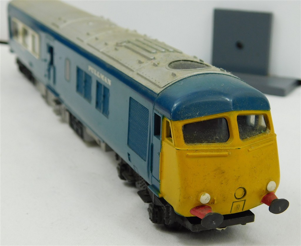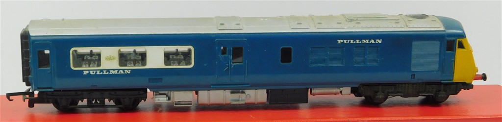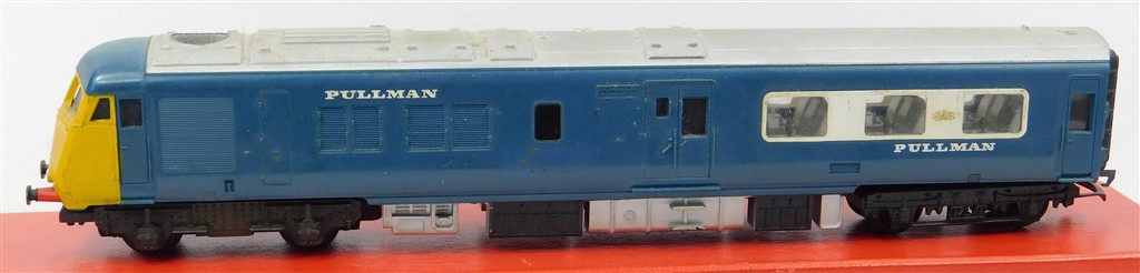 A Tri-ang Hornby full yellow end Blue Pullman power car, reluctant runner: needs a thorough electrical clean and careful lubrication plus running-in, needs a thorough clean, supplied in the tatty original box, sold as a project. Please note this chassis needs a controller capable of delivering at least 600mA to run well, and doesn't like new Hornby or Peco points.