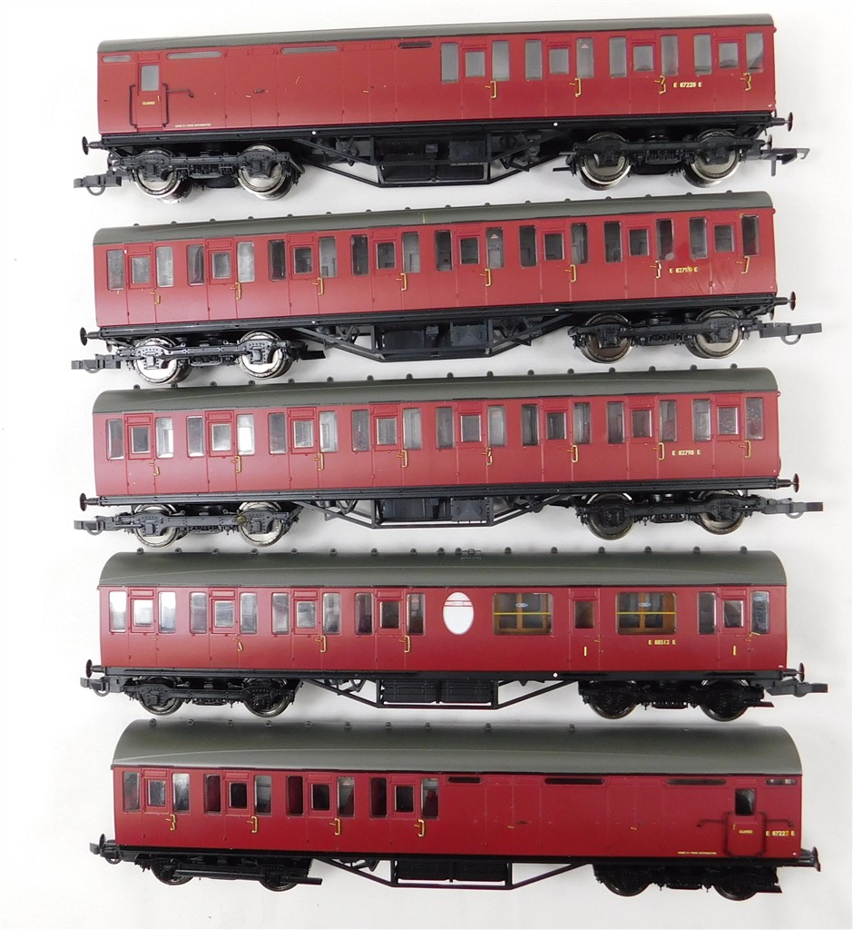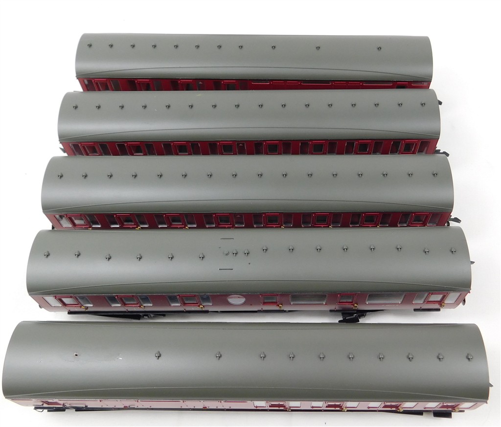 A Hornby rake of 5 Thompson compartment coaches, some renumbering, glue spots, missing roof vent, added dummy tail light, no original boxes