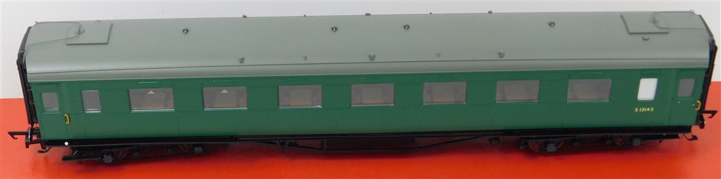 A Hornby BR ex SR rivetted steel open 2nd green coach S1314S (R4538), in good condition, no original box