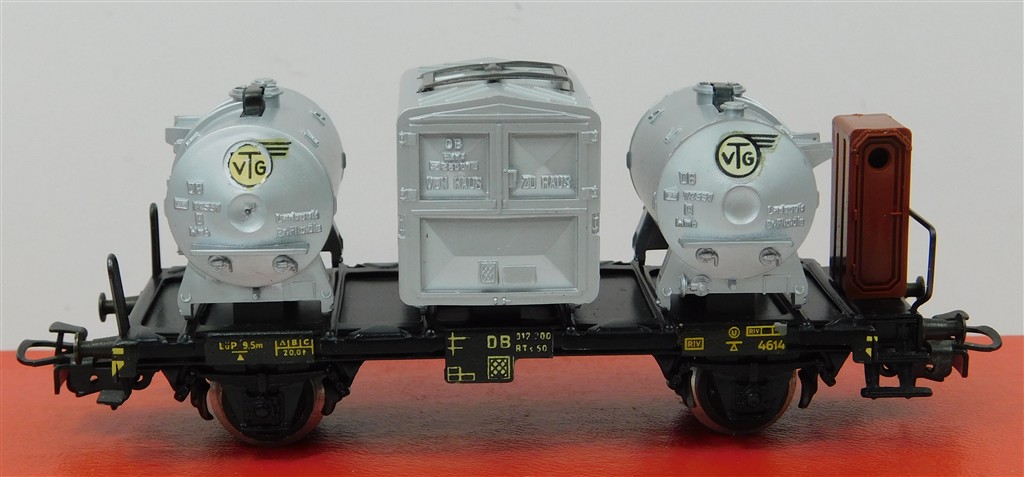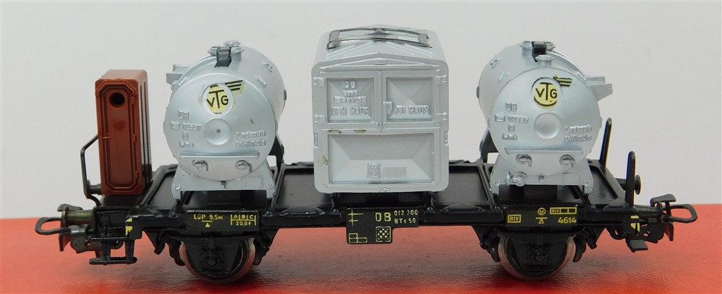 A Märklin 3 rail German DB "Von Haus zu Haus" 3 container wagon with 3 containers, in good clean condition, no original box, fitted with uninsulated metal wheels for 3 rail use