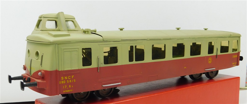 An AS 0 gauge 3 rail French SNCF Picasso railcar XBD 5815 of Toulouse, made in France circa 1989, in very good condition, a good runner but the pickups need to be kept clean for it to run well, supplied in the original wooden box with a rather terse information sheet. A substantial heavy model, mainly metal construction, weighs 2.5kg!