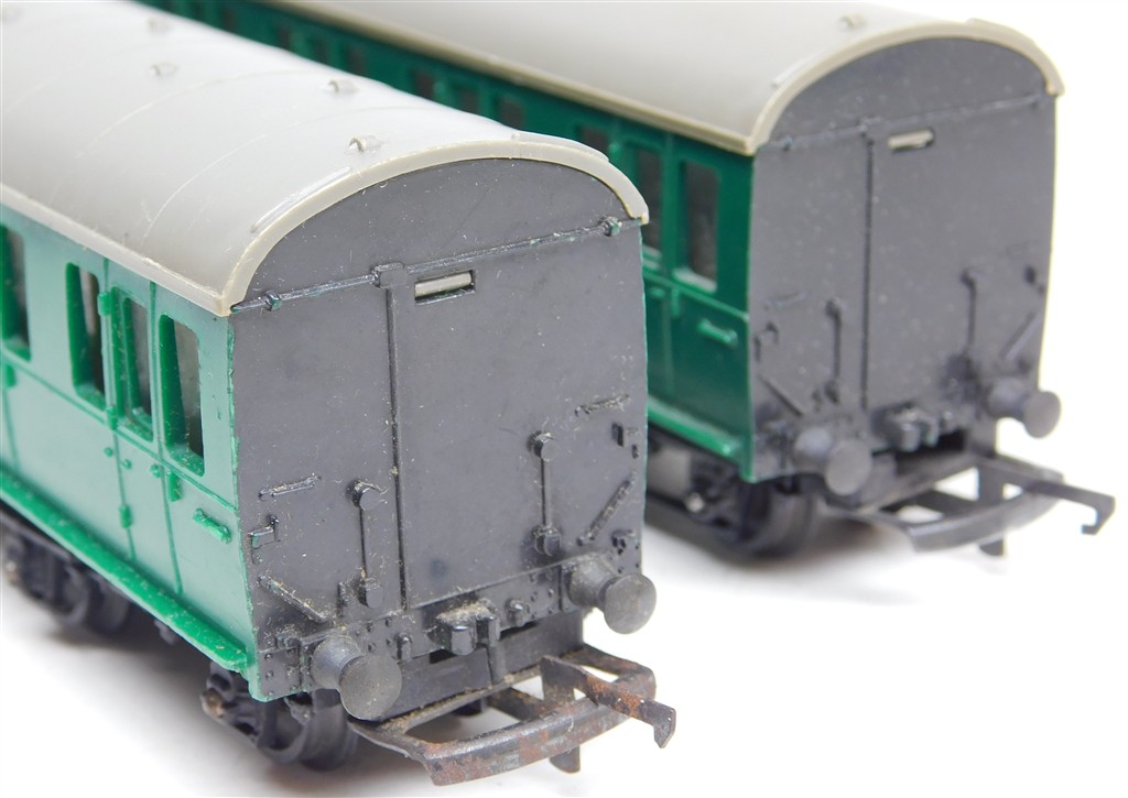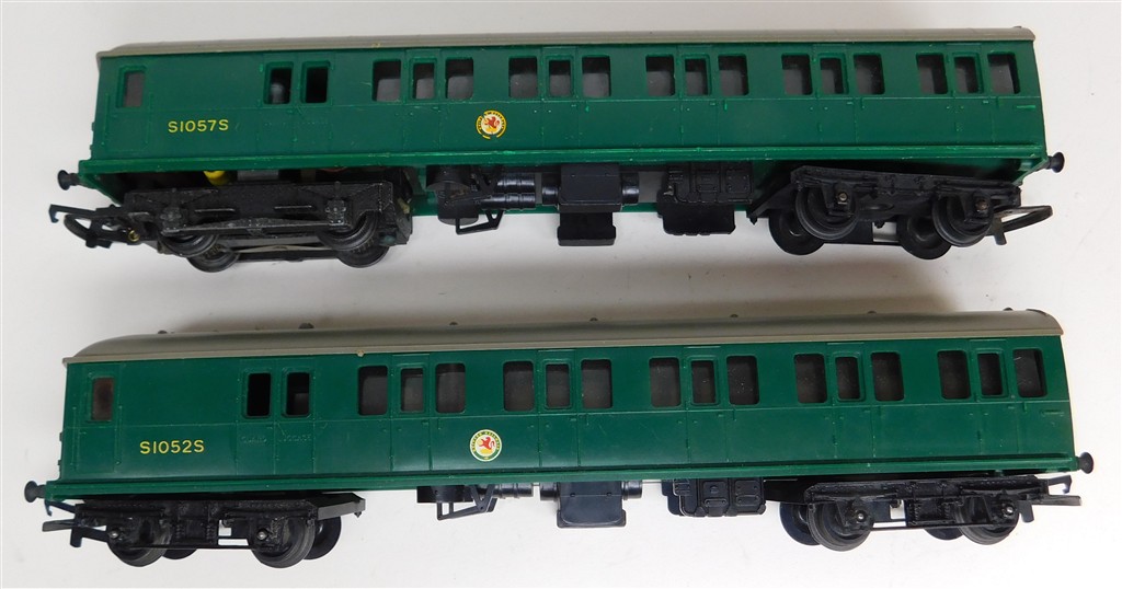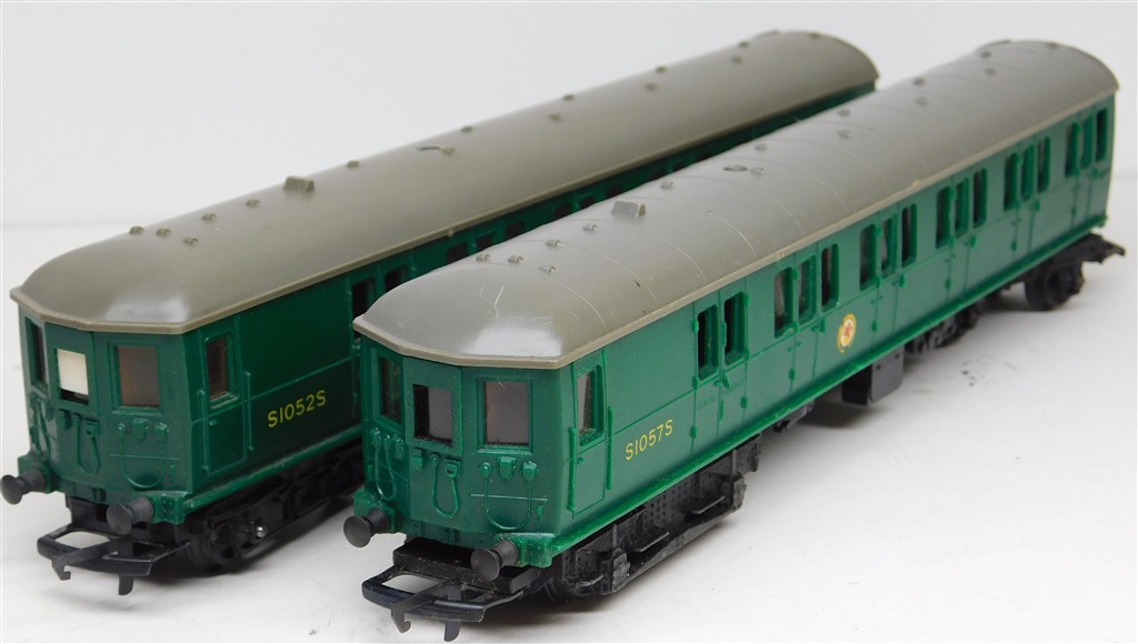 A Tri-ang 2 car EMU, reluctant runner with working light, needs a thorough electrical clean and lubrication, one bogie on the power car needs replacing as it has been chopped, no original box. Please note this chassis needs a controller capable of delivering at least 600mA to run well, and doesn't like new Hornby or Peco points.