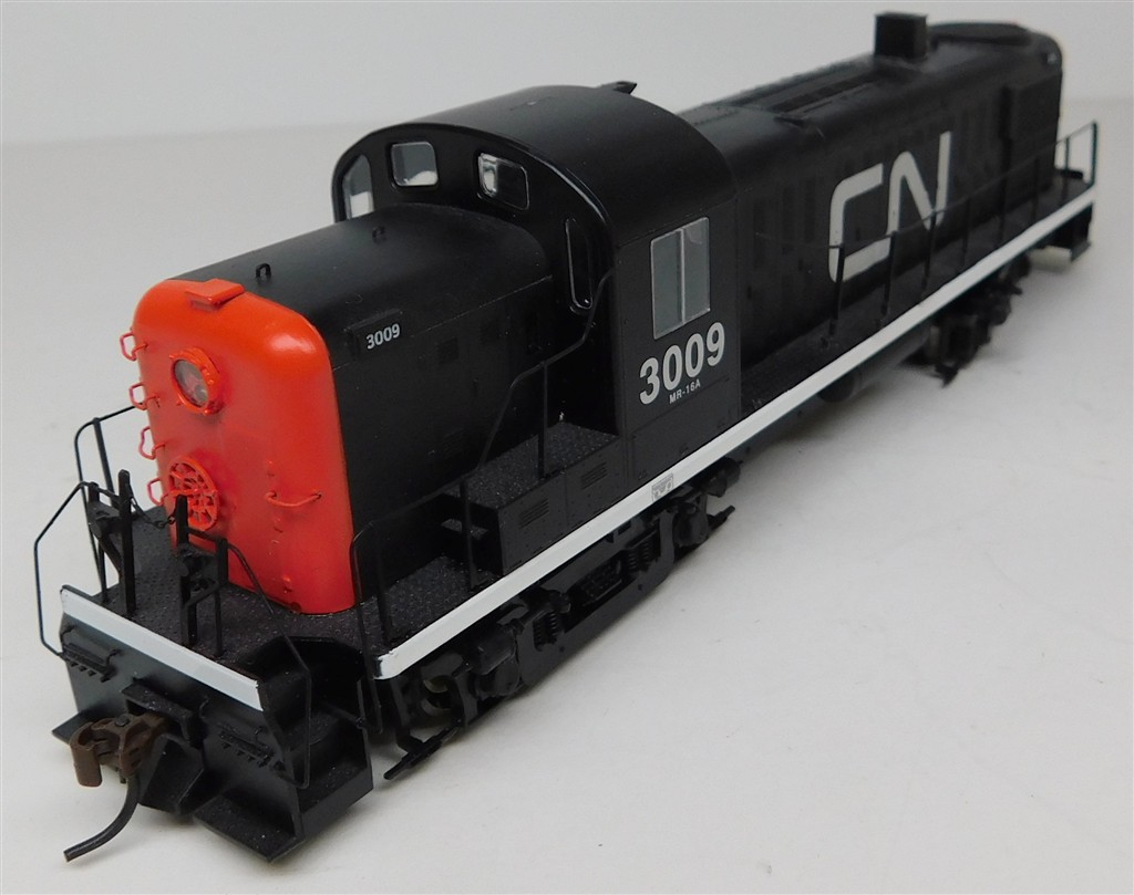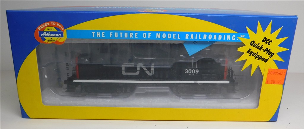 An Athearn Canadian National Alco RS3 diesel loco 3009, good runner with a rhythmic clunk so suspect a split gear needs replacement, needs a clean and handrails need careful refitting otherwise in good condition, supplied in the original box with some instructions, Kadee type couplings