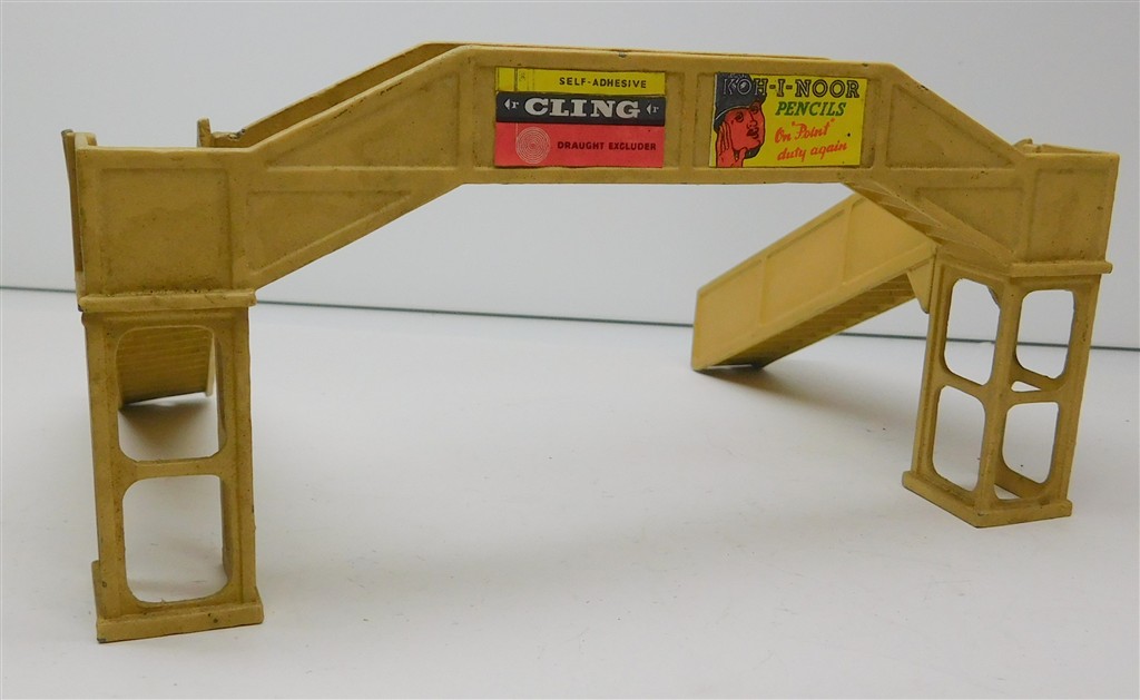 A Hornby Dublo metal footbridge with added Cling and Koh-i-noor adverts, in good condition, no original box
