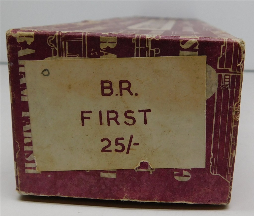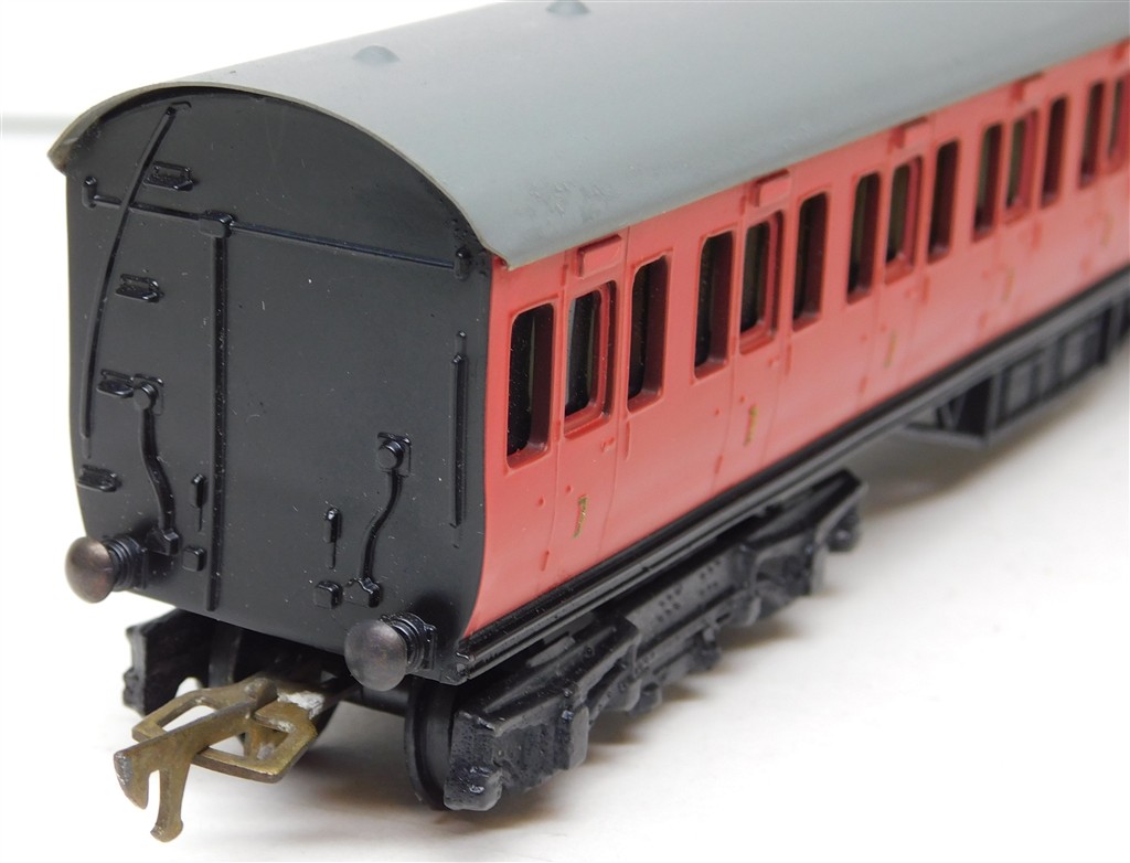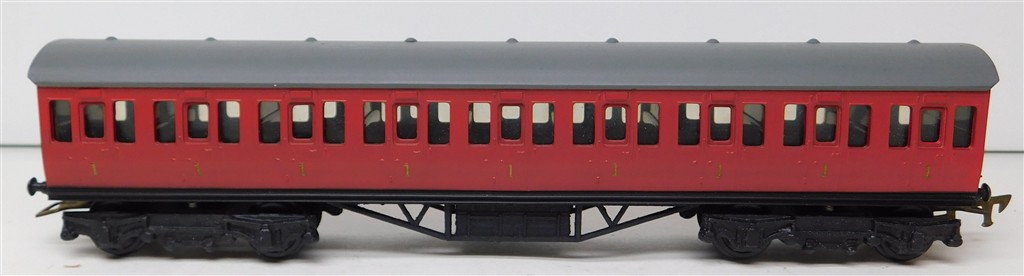 A Graham Farish BR Composite Suburban coach, red, 1950s production, heavy, missing one coupling hook otherwise in good used condition, supplied in an incorrect original box