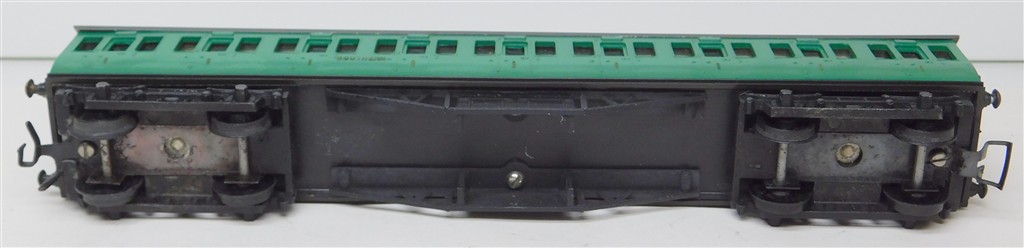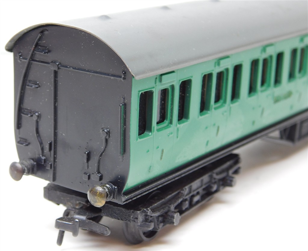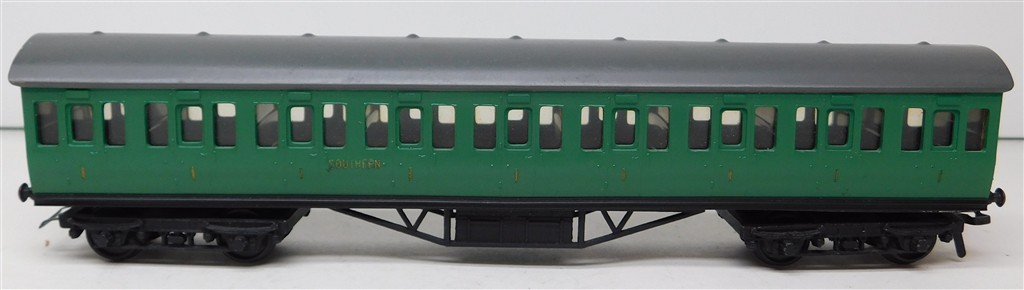 A Graham Farish Southern Railway First Class Suburban coach, green, 1950s production, heavy, coupling changed for a Peco coupling one end, in good used condition, supplied in the original box