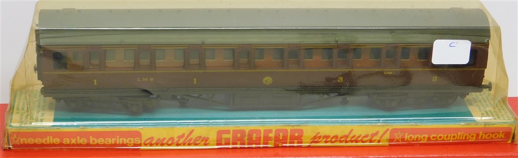 A Graham Farish LMS mainline coach number 9485, chip to corner of roof and one broken buffer otherwise in good condition, supplied in an original box (C)