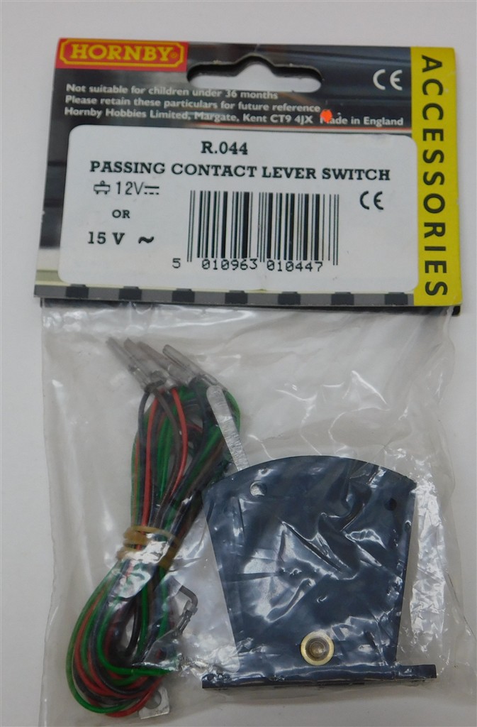 An unopened Hornby R044 Passing Contact Lever Switch with wires for operating point motors