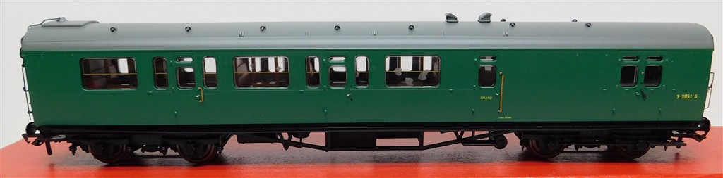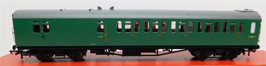 A Hornby R4888A BR Bullied Suburban Brake 3rd coach S2852S, missing vent, added tail lamp, glue spots on windows, in fair condition, supplied in the original box, please study the photographs carefully