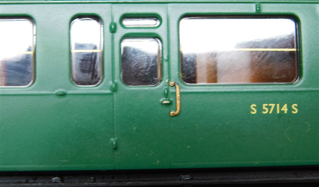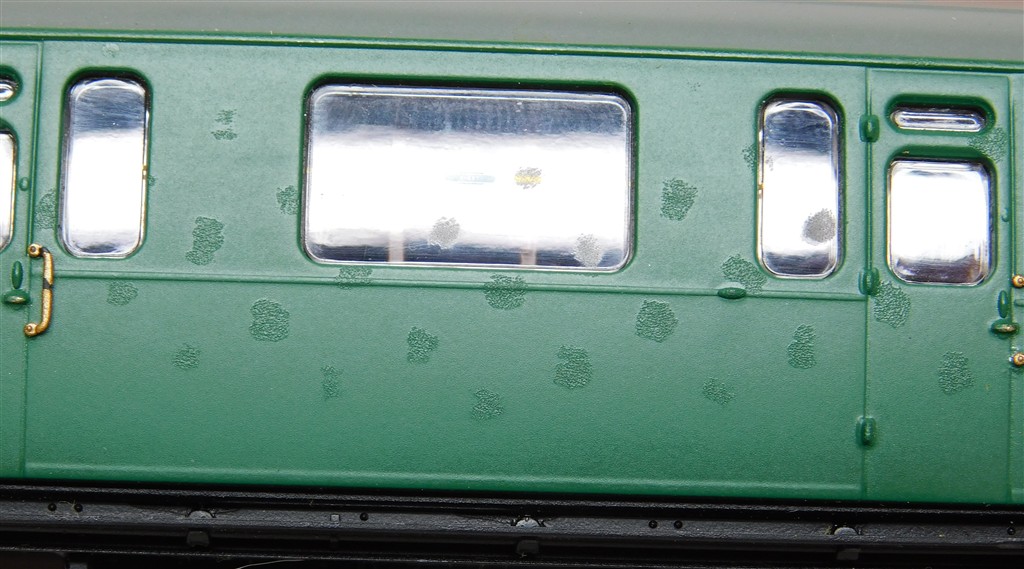 00 Coaches: Hornby R4886 BR Bullied Suburban Composite coach S5714S, extensive glue spots/blistered paint, weathering candidate?