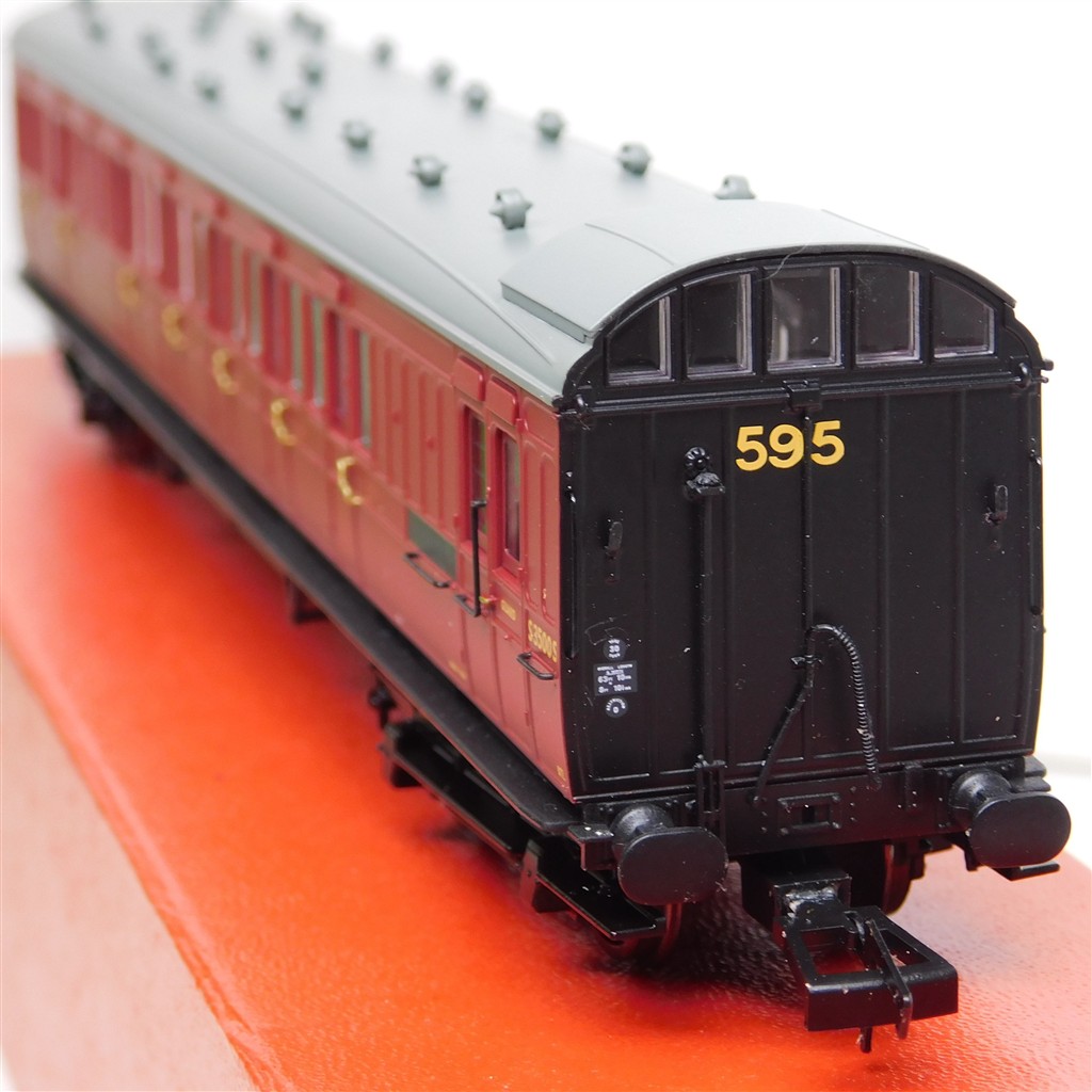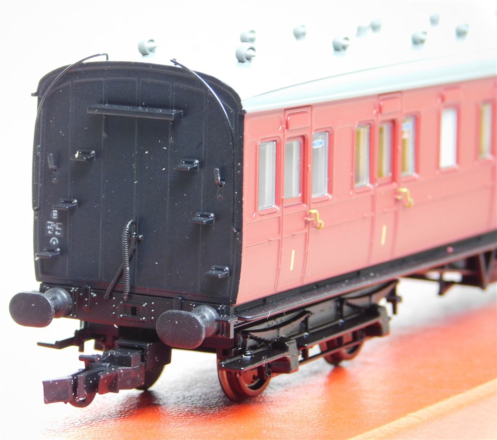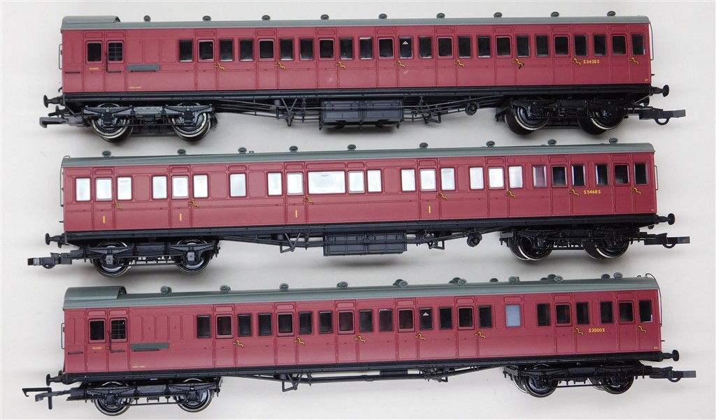 A rake of 3 Bachmann 39-602, 39-612 and 39-622 BR ex SR Birdcage coaches S3428S, S5468S and S3500S, maroon, NEM couplings fitted, some glue spots from added dummy tail lamps and refitted handrails otherwise in good condition, supplied in the original packaging