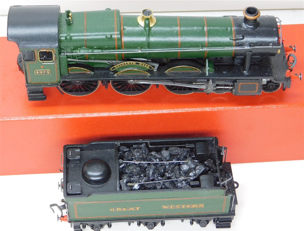 A Wills kitbuilt GWR Hall 4-6-0 steam loco number 4974 Talgarth Hall with Romford wheels, reluctant runner that needs a thorough electrical clean and lubrication, nicely assembled and painted, brass main drive gear, no original box