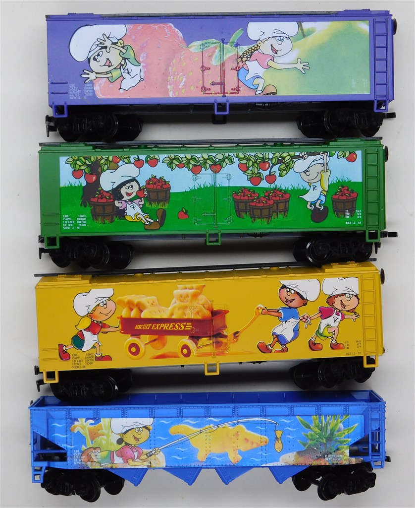 American H0: 3 Mehano H0 scale box cars and a hopper car from a set with horn-hook couplings