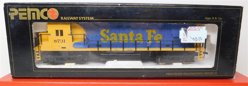 A Pemco 3302-001 Alco 430 diesel loco Santa Fe number 8731, noisy runner with working directional headlights, would benefit from careful lubrication, in good condition, supplied in the original box with instructions, horn-hook couplings