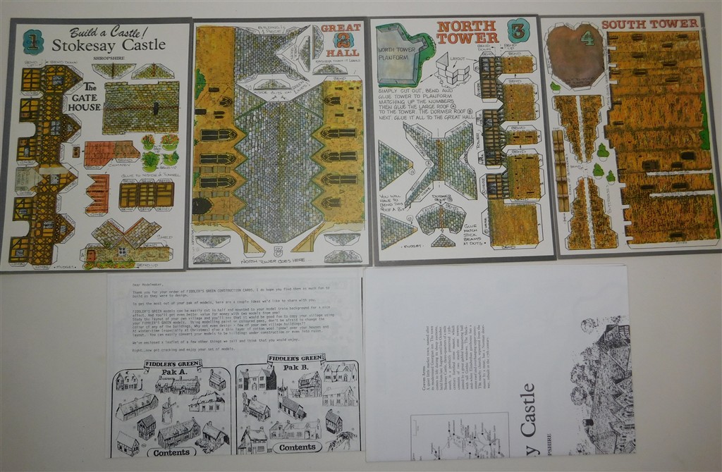 An unassembled Fiddler's Green smaller than N scale Stokesay Castle in Shropshire cardboard kit, 4 sheets, each card measures 221mm by 151mm, door heights 9-15mm (4'6"-7'6" in N scale), useful as a background model