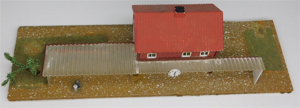 An OWO N gauge German assembled small station with lopsided tree, wooden base, in good condition, no original box