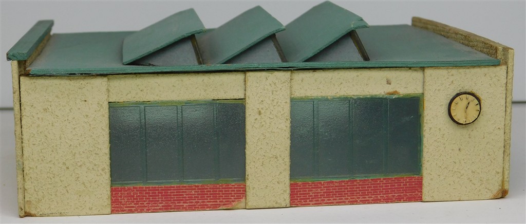 A Temos N gauge German assembled wooden 3 track diesel loco shed, made from hardboard in East Germany, opening doors, in good condition, no original box