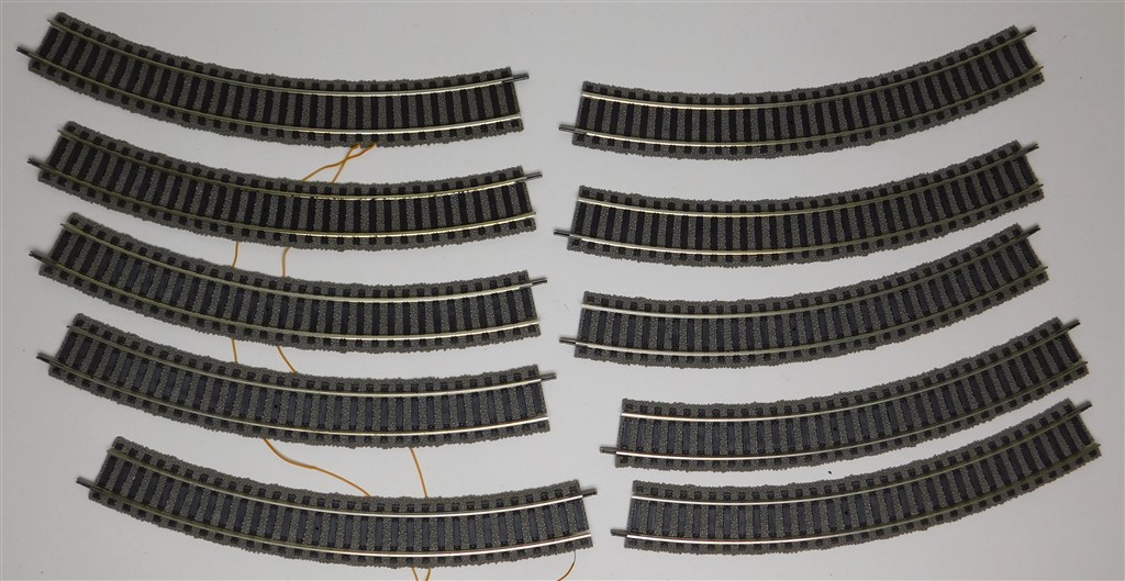 A complete circle of ten Fleischmann Profi-track 6120 356.5mm radius 36° curves including one with power connecting wires, in good condition, no original box
