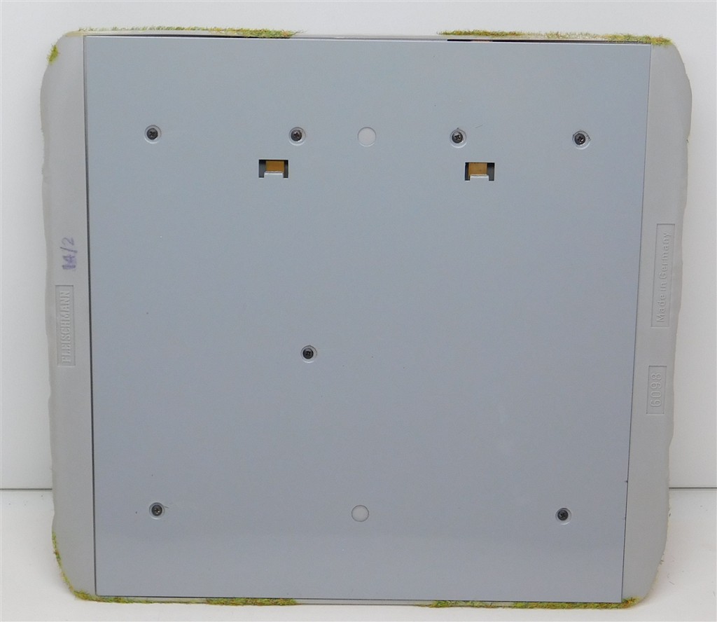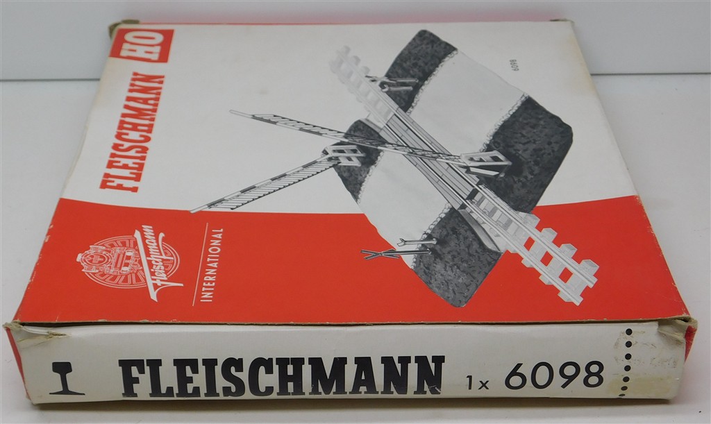 A Fleischmann 6098 level crossing, in principle operated by the weight of a train passing over but the mechanism is locked and needs dismantling and cleaning, in very good cosmetic condition, supplied in the original, missing wood effect inserts