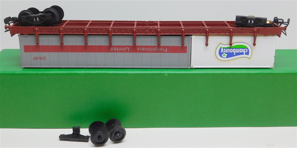 A Jouef container wagon with broken bogie, all parts present, apart from the broken bogie in good condition, no original box