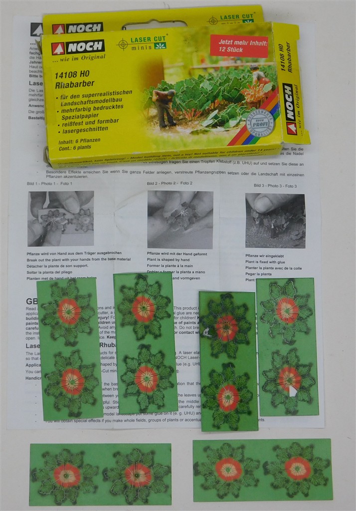 An opened but unused Busch H0 scale Laser-Cut Mini Plants kit supplied in the original box with instructions: 14108: Rhubarb (12)