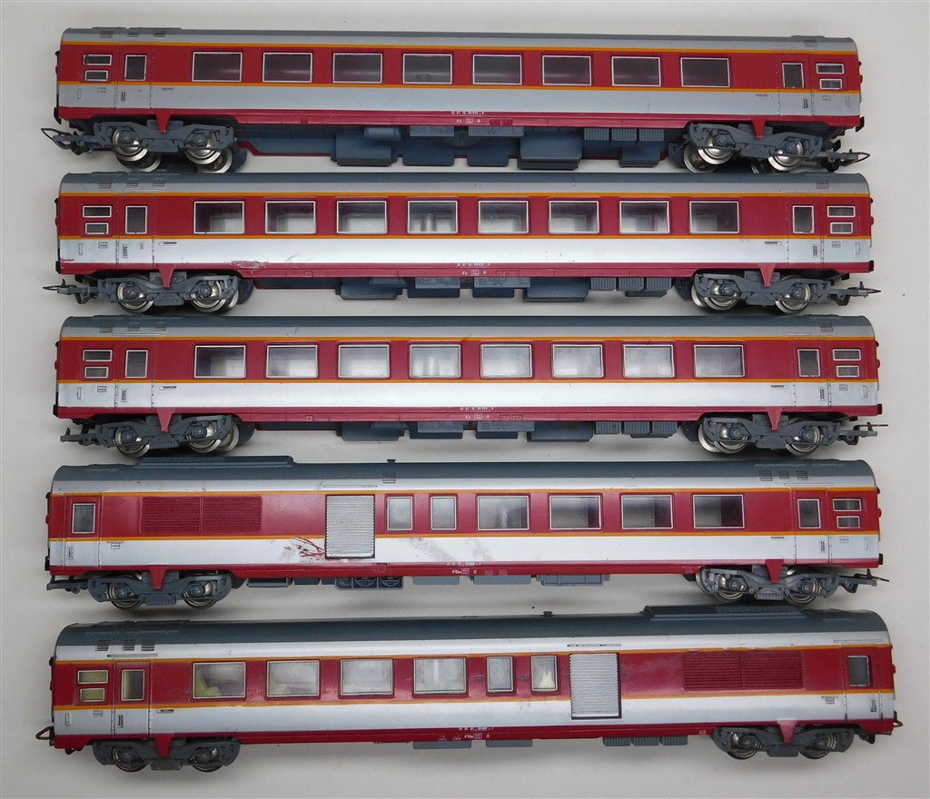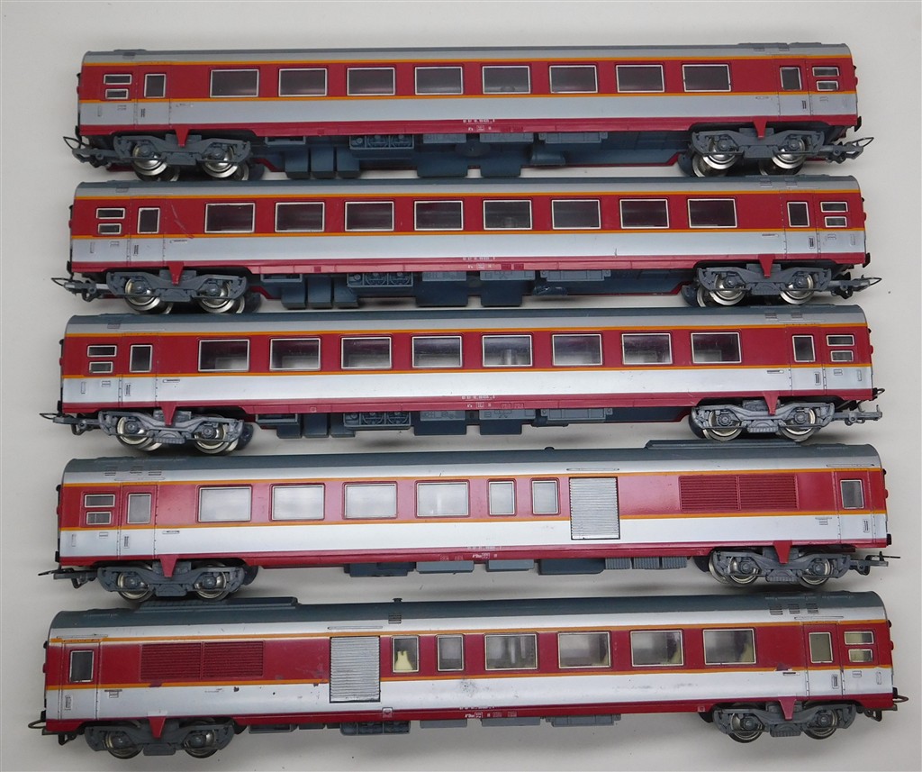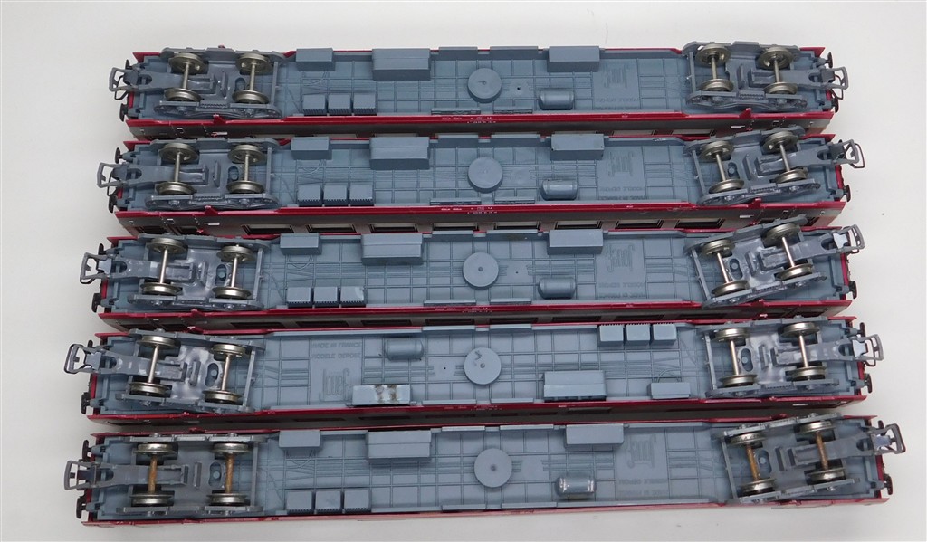 5 incomplete/damaged Jouef SNCF red and silver coaches, playworn, restoration project - repaint candidates