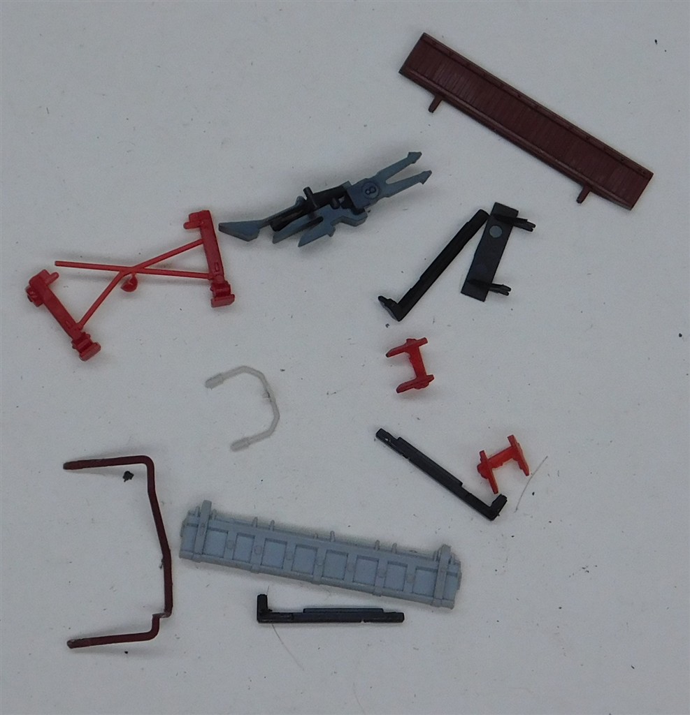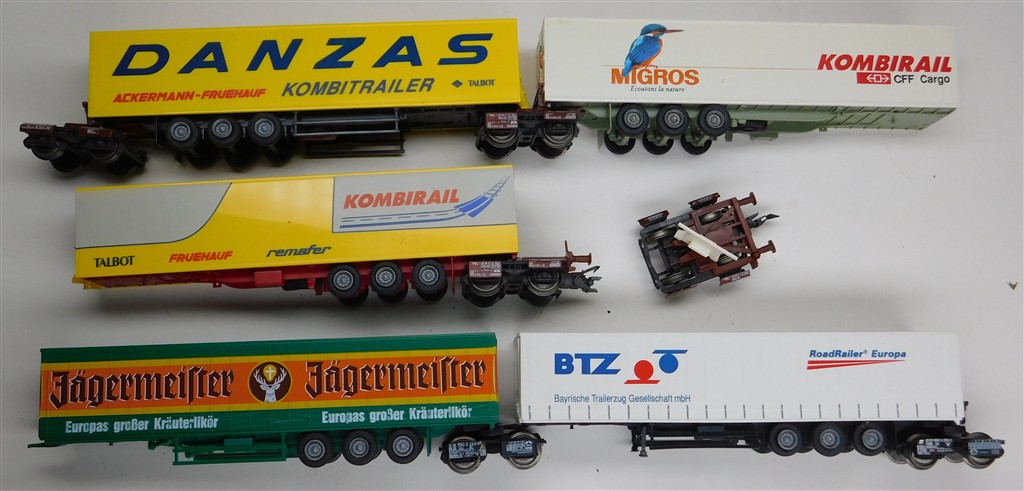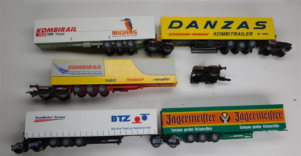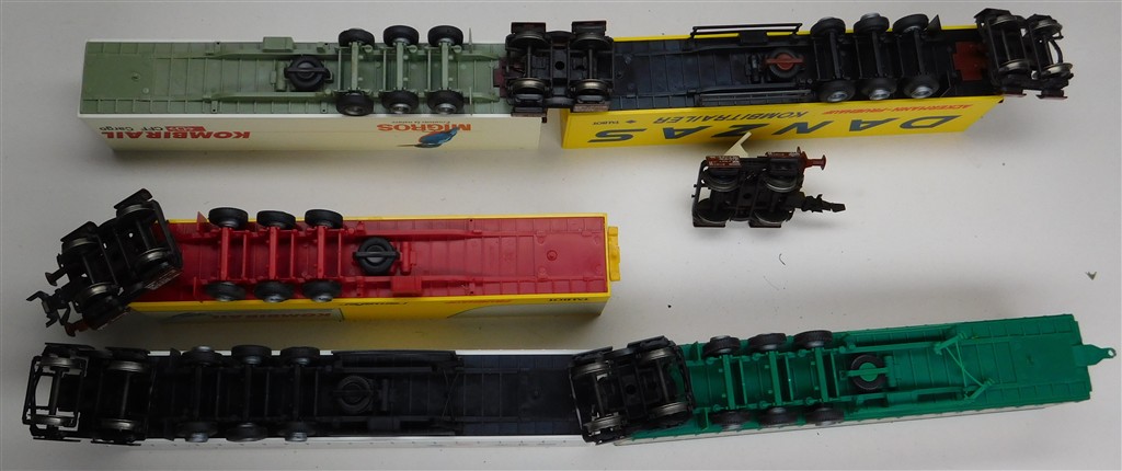 A 5 section Roco lorry trailer transport set with 6 bogies including 2 with buffers and couplings, in good used condition, no original box, supplied with a bag of mixed oddments