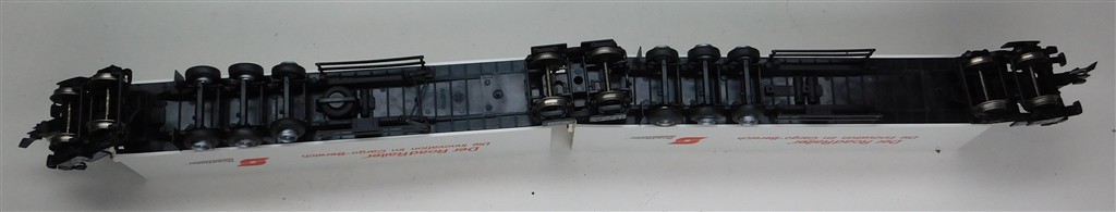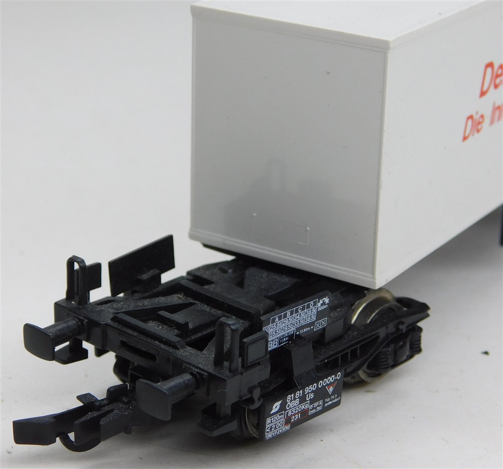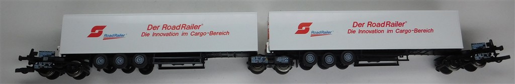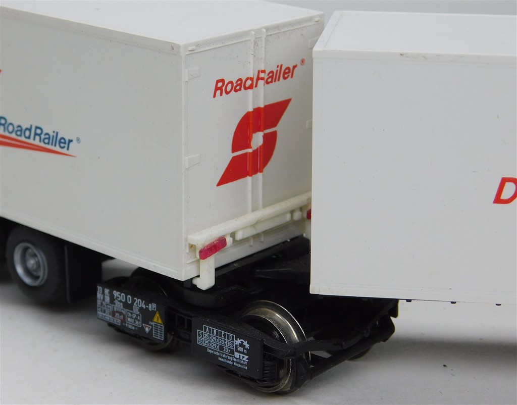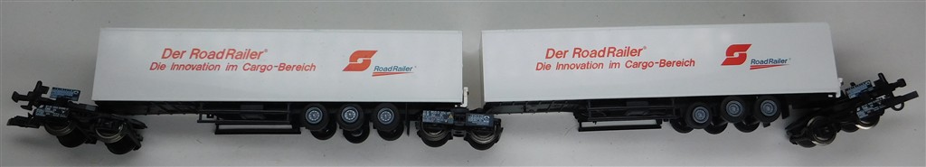 A 2 section Roco Austrian ÖBB Der RoadRailer lorry trailer transport set with 3 bogies including 2 with buffers and couplings, in good used condition, no original box, supplied with a bag of mixed oddments