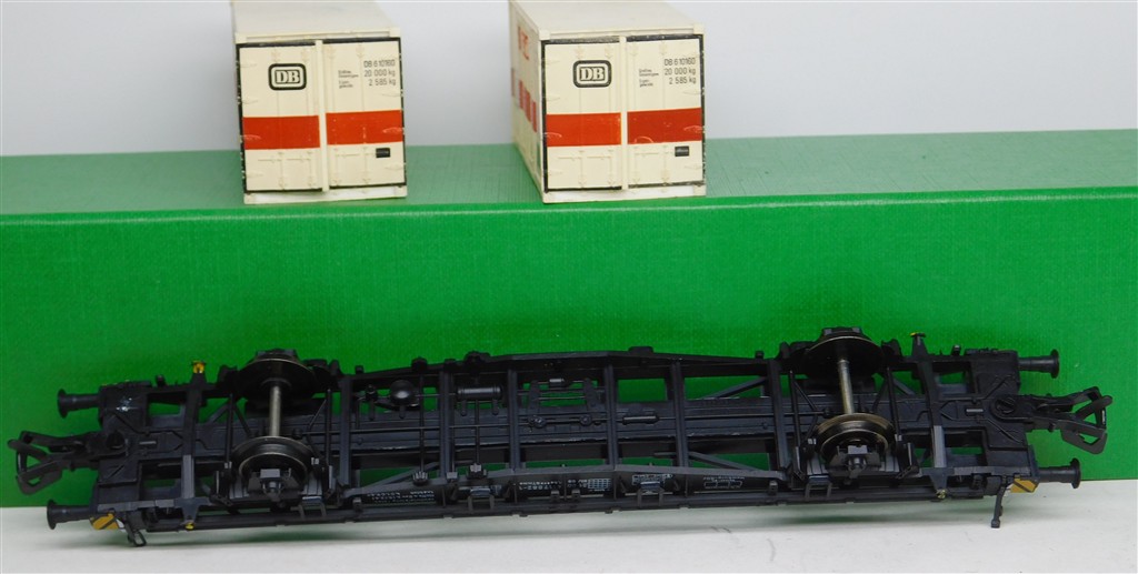A Fleischmann German container wagon with Fleischmann containers, warped wagon body, pivoted Fleischmann couplings, no original box