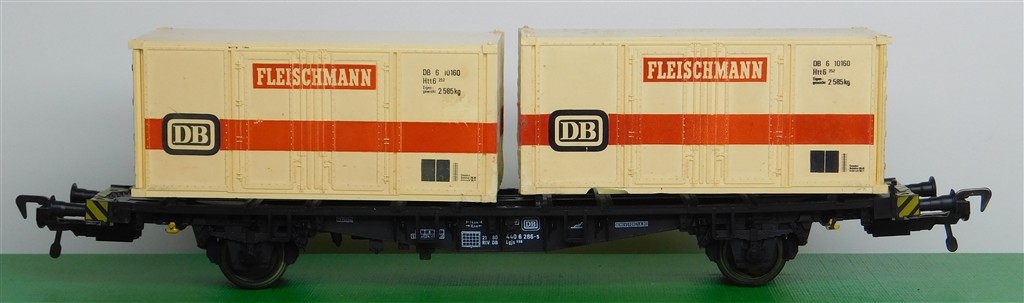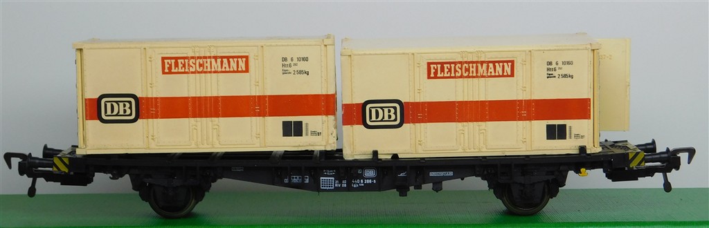 A Fleischmann German container wagon with Fleischmann containers, warped wagon body, NEM pocket couplings with close coupling mechanisms, , no original box